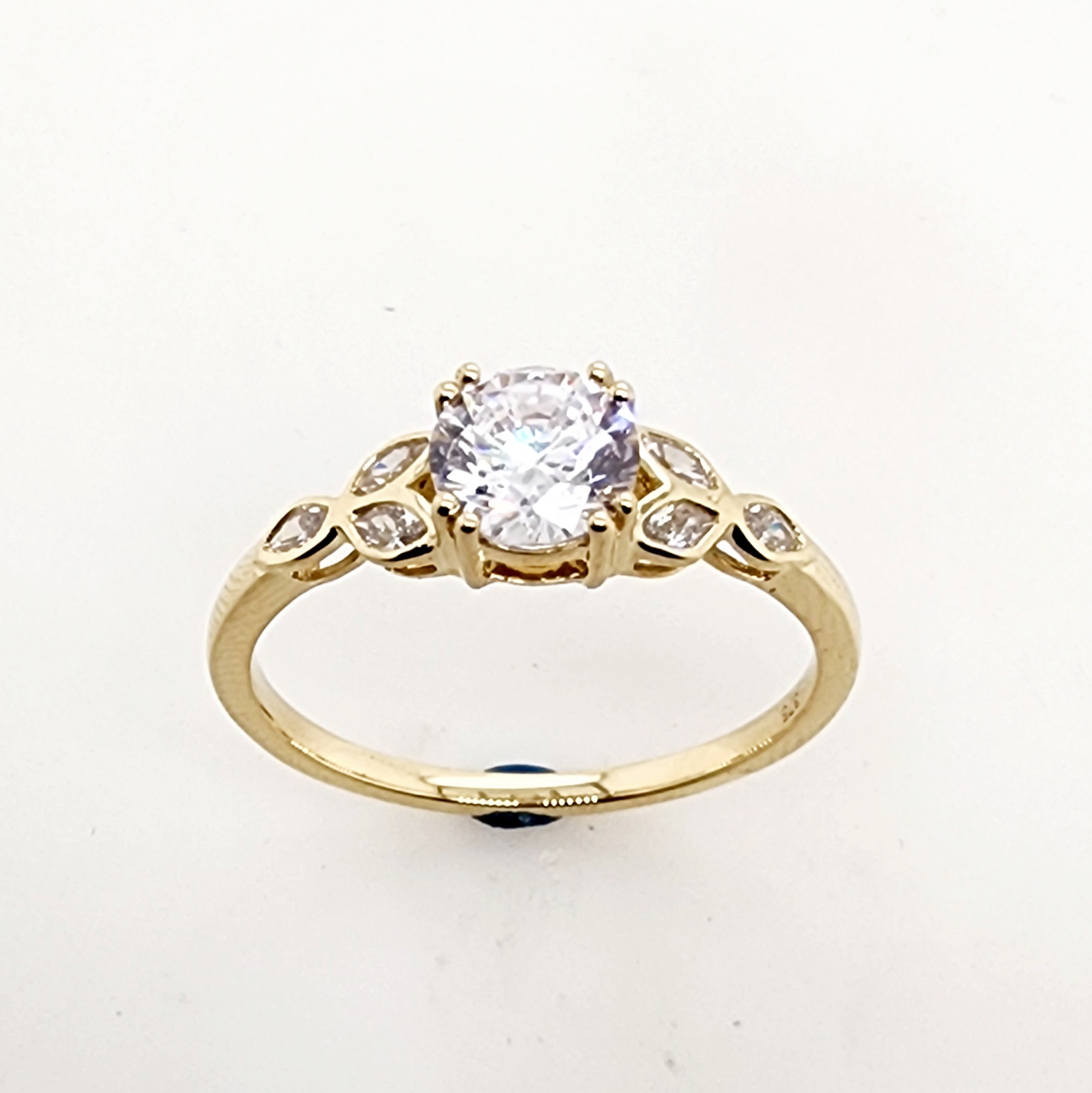 Unique womens engagement ring features a 6.50mm round brilliant cut CZ and 6 oval cut accent CZ’s. The accent CZ’s are rubover set in petal vine settings that flank the center stone. All CZ’s are set in solid 9ct yellow gold high polished mounting. This ring is unique and has the right amount of flash to be worn every day.