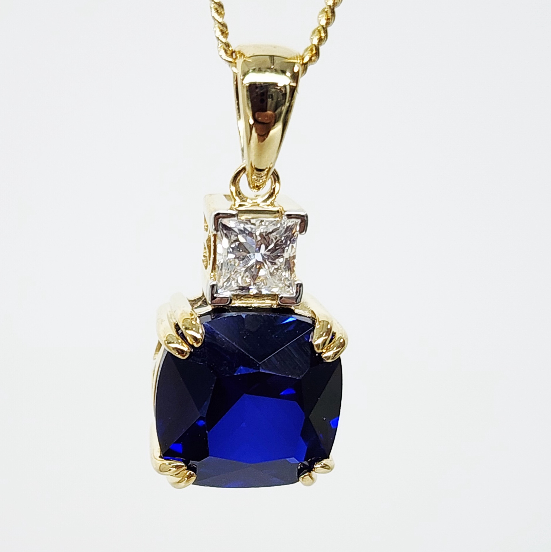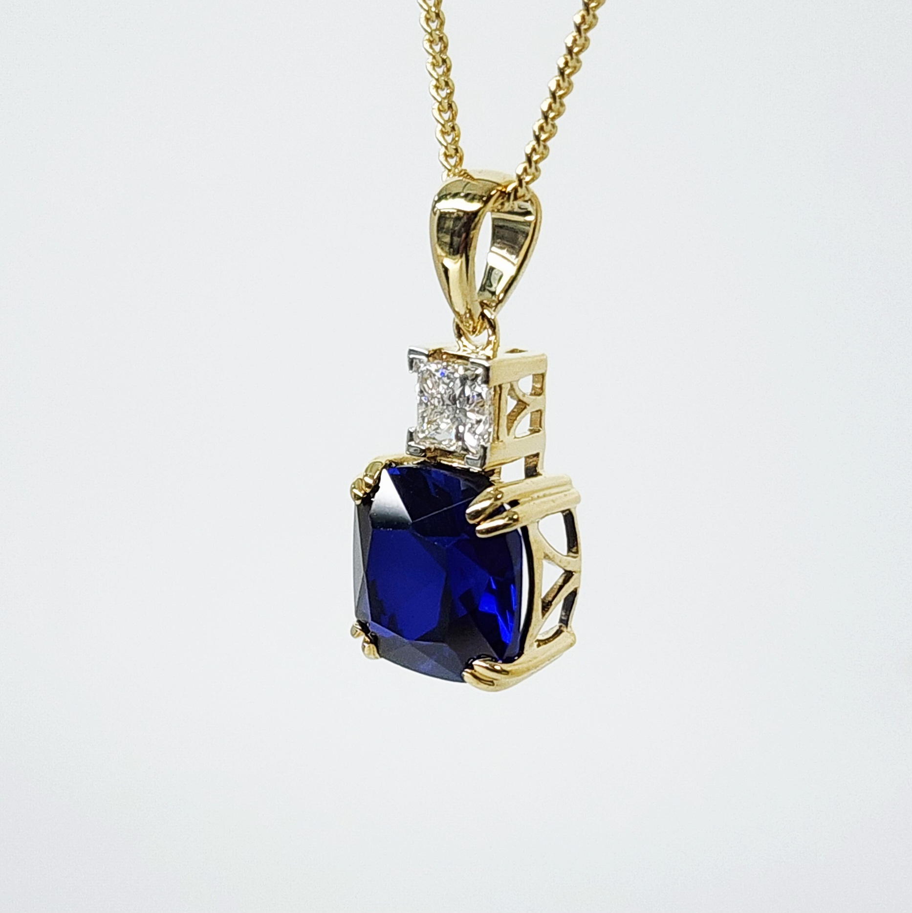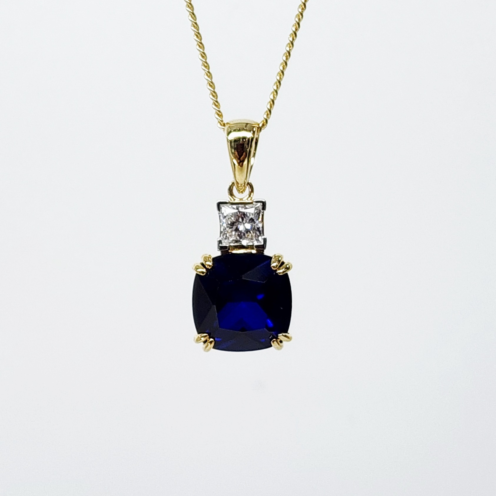 9ct Yellow Gold Cushion Cut Created Ceylon Sapphire and 0.33ct Princess Cut Lab Grown Diamond Pendant – D/A472PD-CCSLGD