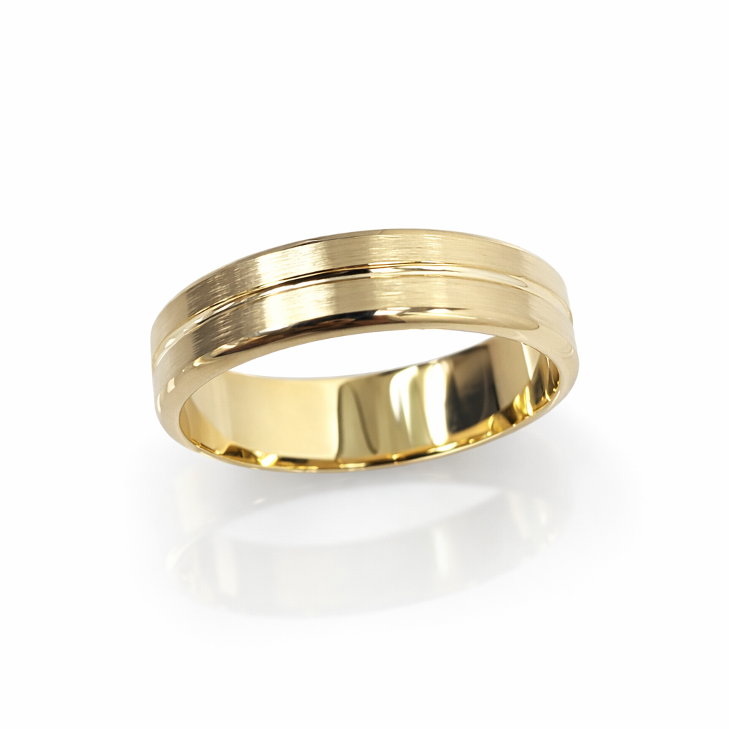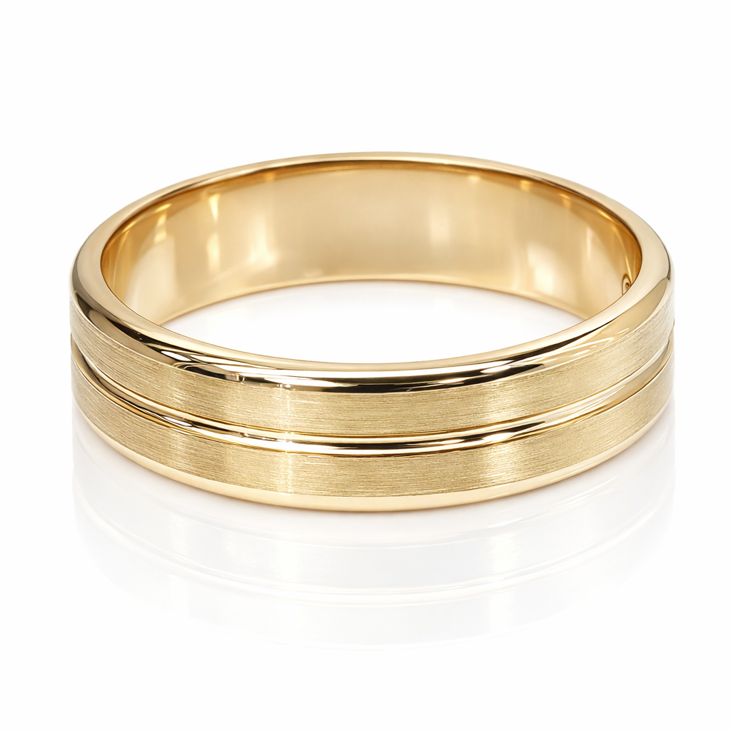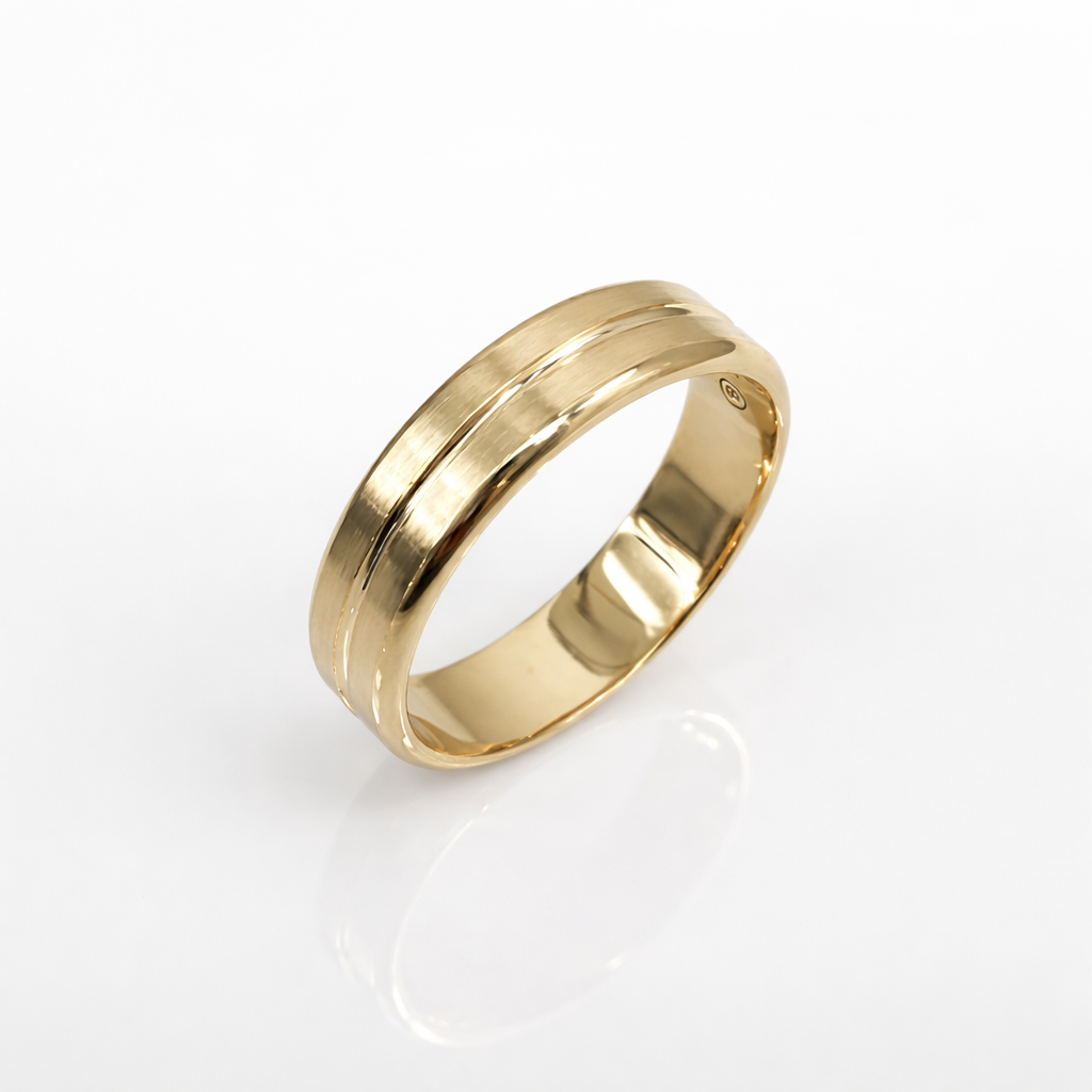 The design showcases a sophisticated double brushed satin finish centre panels, separated by a polished recessed groove running through the middle. Highly polished rounded edges frame the ring beautifully, creating contrast and enhancing the warm golden tone of the metal.
