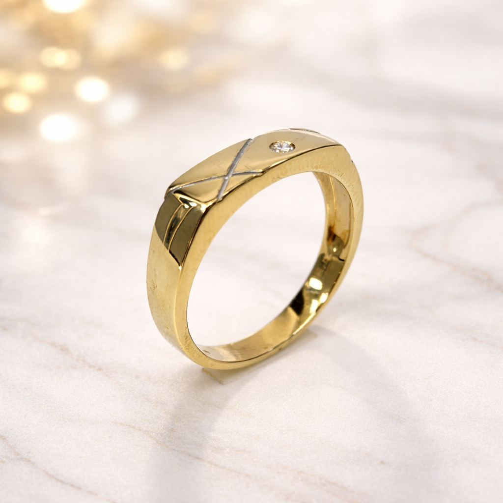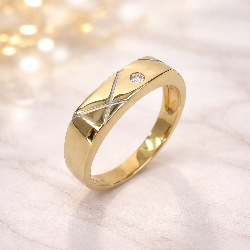 A distinctive highlight of this ring is the precision-engraved cross-line detailing, accented in a contrasting tone, creating a striking visual contrast against the rich yellow gold finish. This unique pattern adds a modern edge while maintaining a timeless appeal.