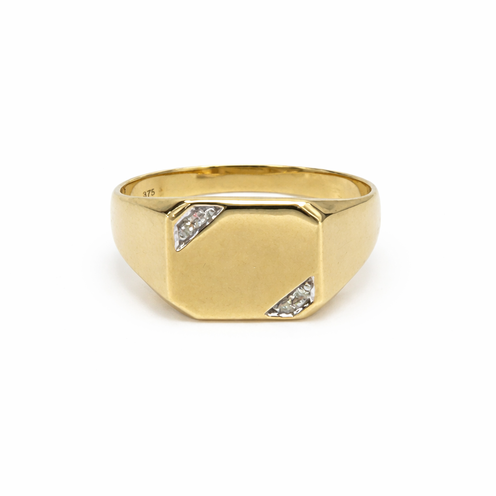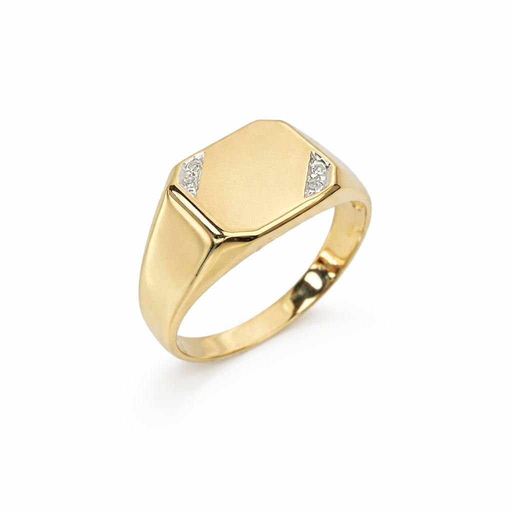 Make a confident statement with this classic gents signet-style ring, crafted in rich 9ct yellow gold and finished with a subtle touch of sparkle. Designed to suit both wedding wear and everyday dress styling, this ring delivers a clean, masculine profile with timeless appeal.