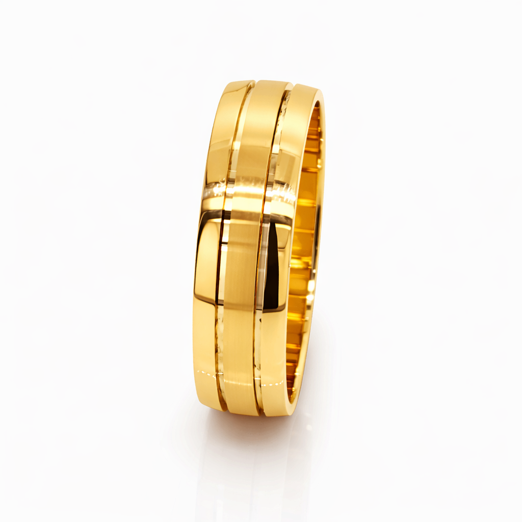 The centre of the band showcases a brushed satin finish, adding subtle texture and contemporary appeal. This is beautifully contrasted by high-polish side rails, which enhance the natural warmth of the gold and create a striking visual depth. Fine faceted accent lines run alongside the brushed centre, delivering a clean, masculine finish with understated elegance.