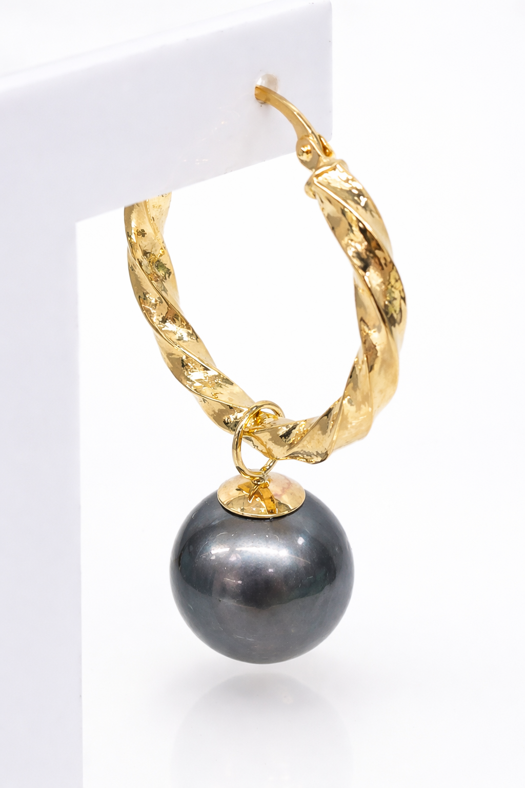 The striking Tahitian pearls display deep charcoal, silver and peacock overtones with natural iridescence, making every pair unique. Their generous size creates a bold yet refined statement, while the twisted hoop design adds texture, brilliance and contemporary appeal.
