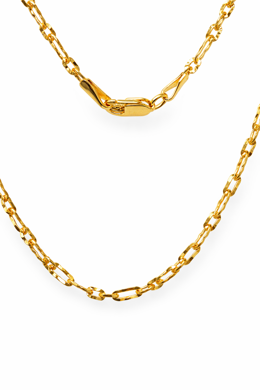 The chain showcases a precise balance of proportion and comfort. The long links (4.80mm x 2.05mm) provide a sleek, elongated appearance, while the short links (2.60mm x 2.05mm) add structure and rhythm to the design. This combination results in a fluid, elegant drape around the neckline, making it perfect for both standalone wear or layering with pendants.