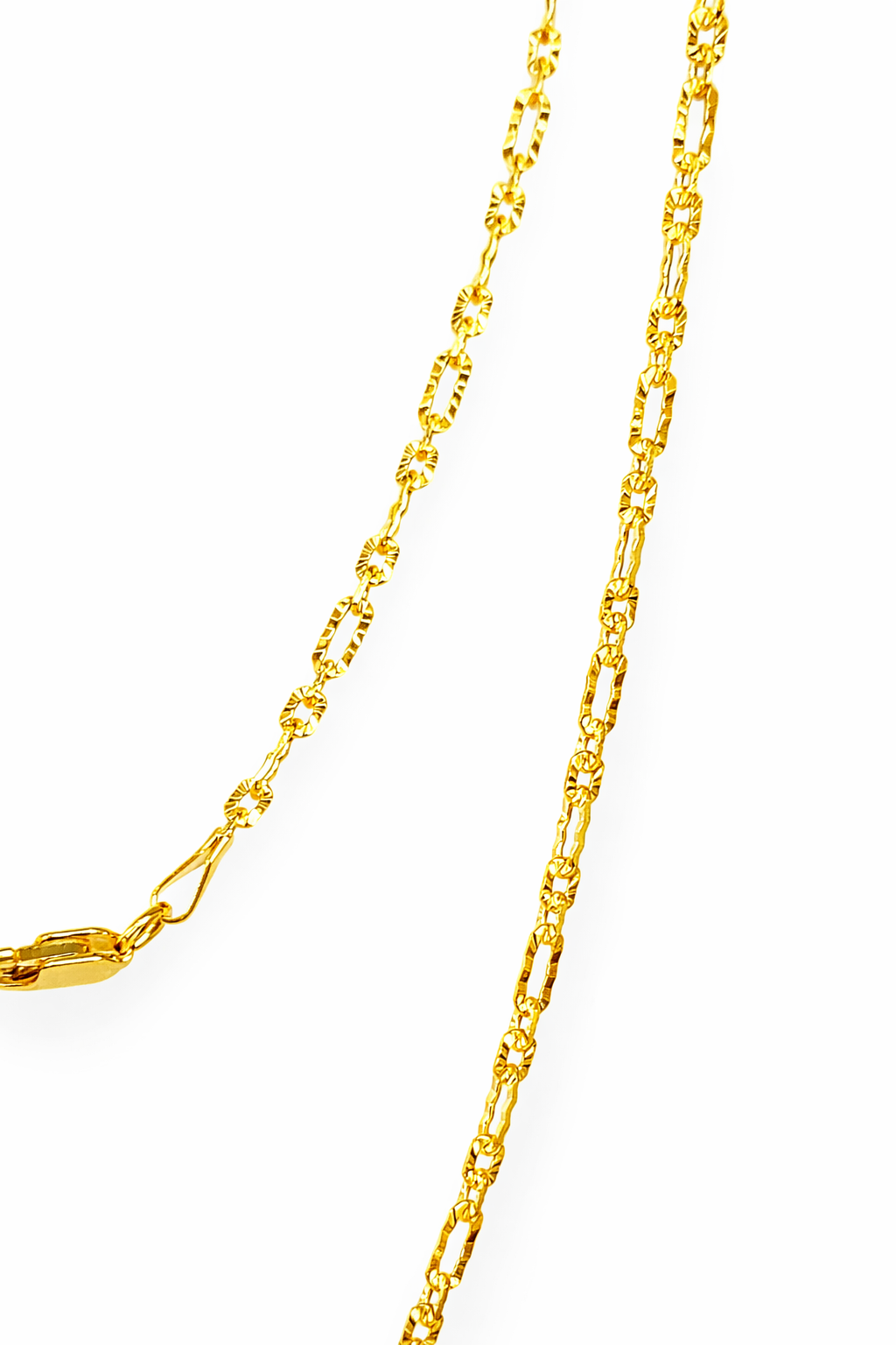Expertly manufactured in Italy—renowned for its superior gold craftsmanship—this chain features a refined Figaro link design, enhanced with a distinctive “Super Star” finish. The alternating pattern of elongated and shorter links creates a classic yet modern look, while the finely faceted detailing adds exceptional sparkle, catching light from every angle for a radiant, high-polish finish.