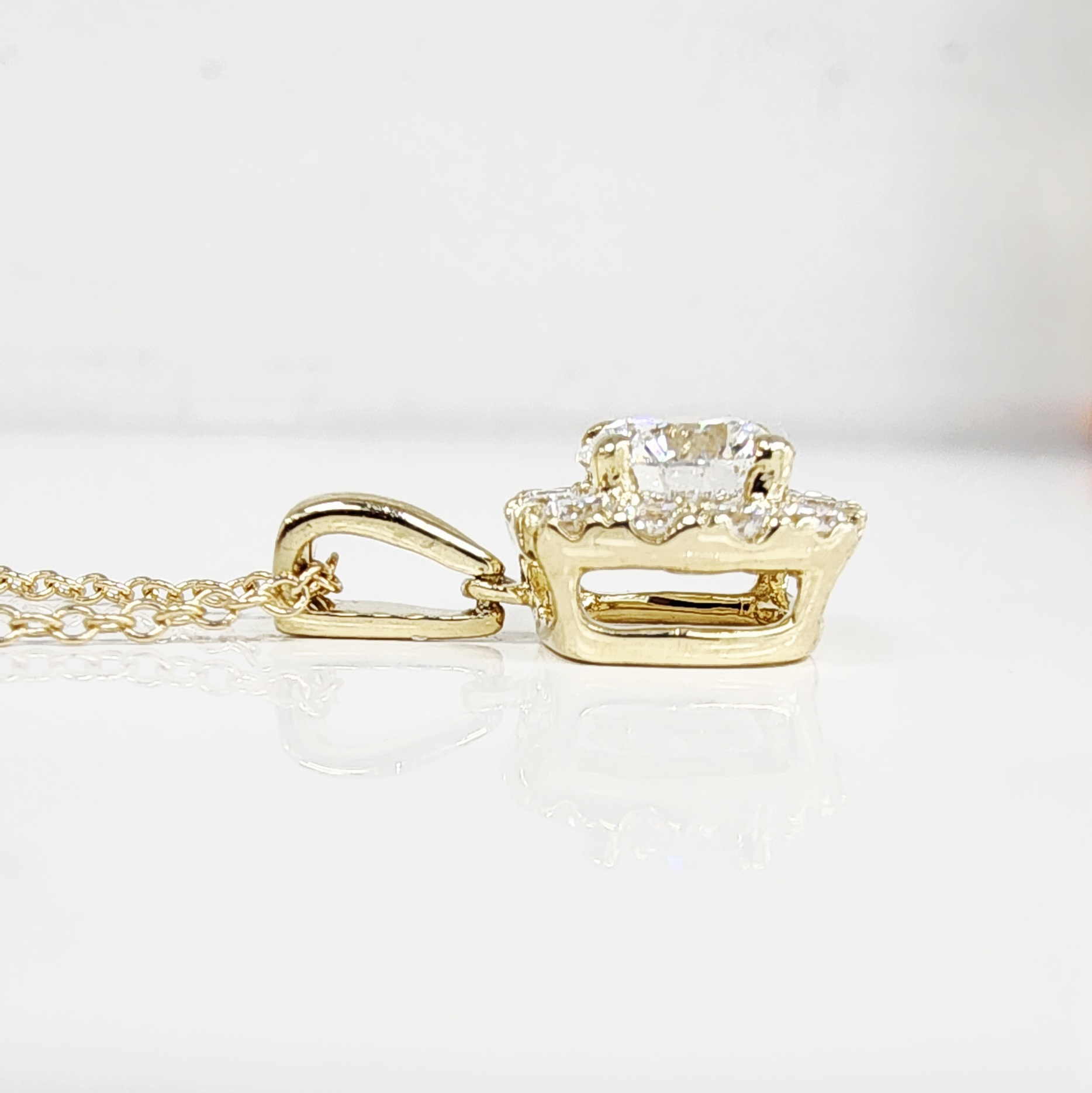 Radiant and timeless, this 9ct yellow gold lab-grown diamond cluster pendant exudes elegance and brilliance. Featuring a total diamond weight of 0.83ct, the centre showcases a 5.20mm round lab-grown diamond held securely in a classic four-claw setting. Surrounding it is a halo of smaller round brilliant-cut diamonds, each individually claw-set to enhance the pendant’s sparkle.