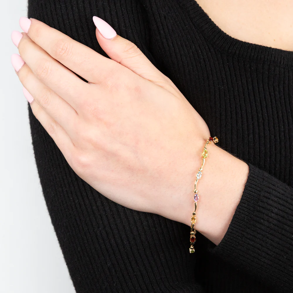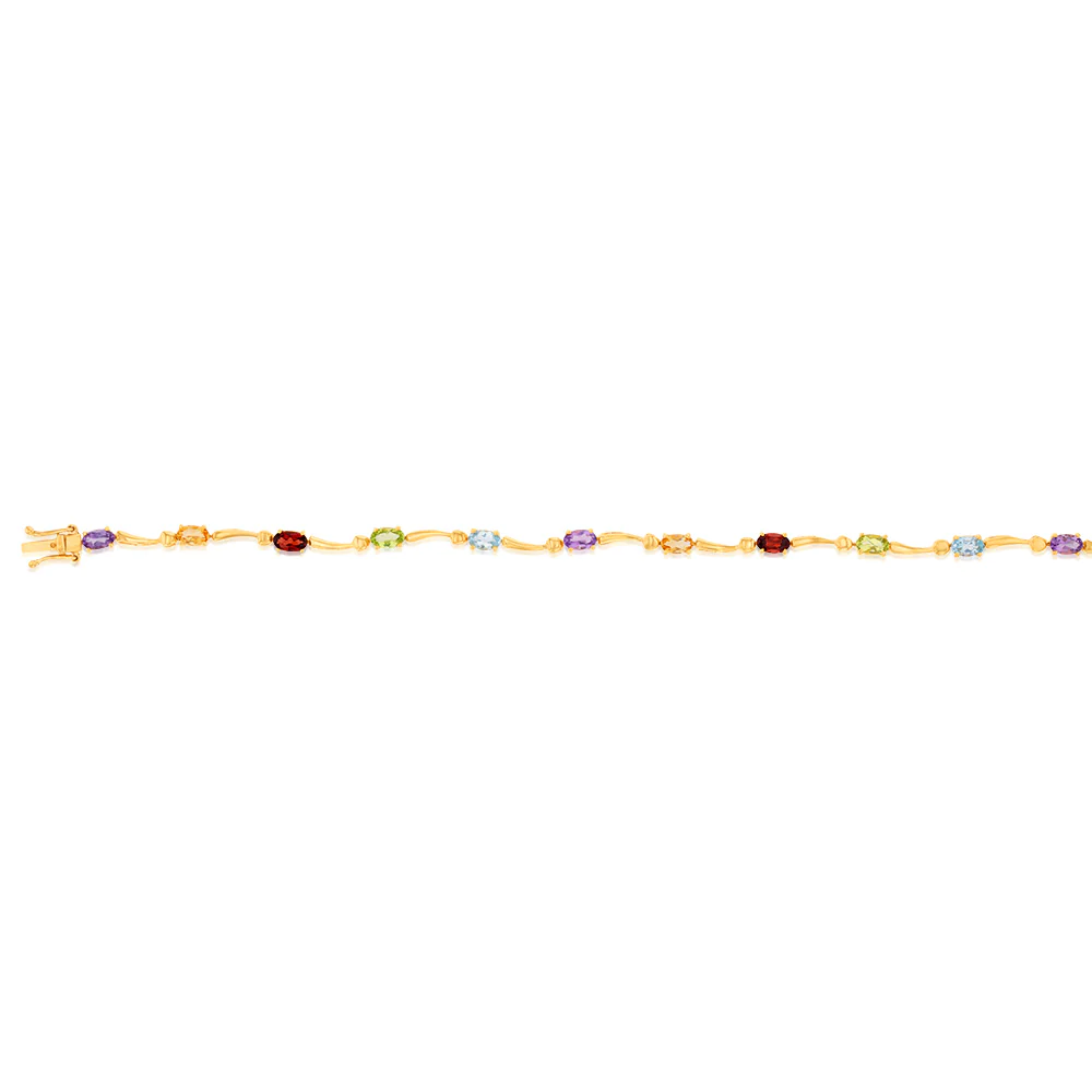 Beautifully crafted from 9ct yellow gold this multi-coloured gemstone wave bracelet gives a pop of colour to your wrist. This makes the perfect gift for a loved one.