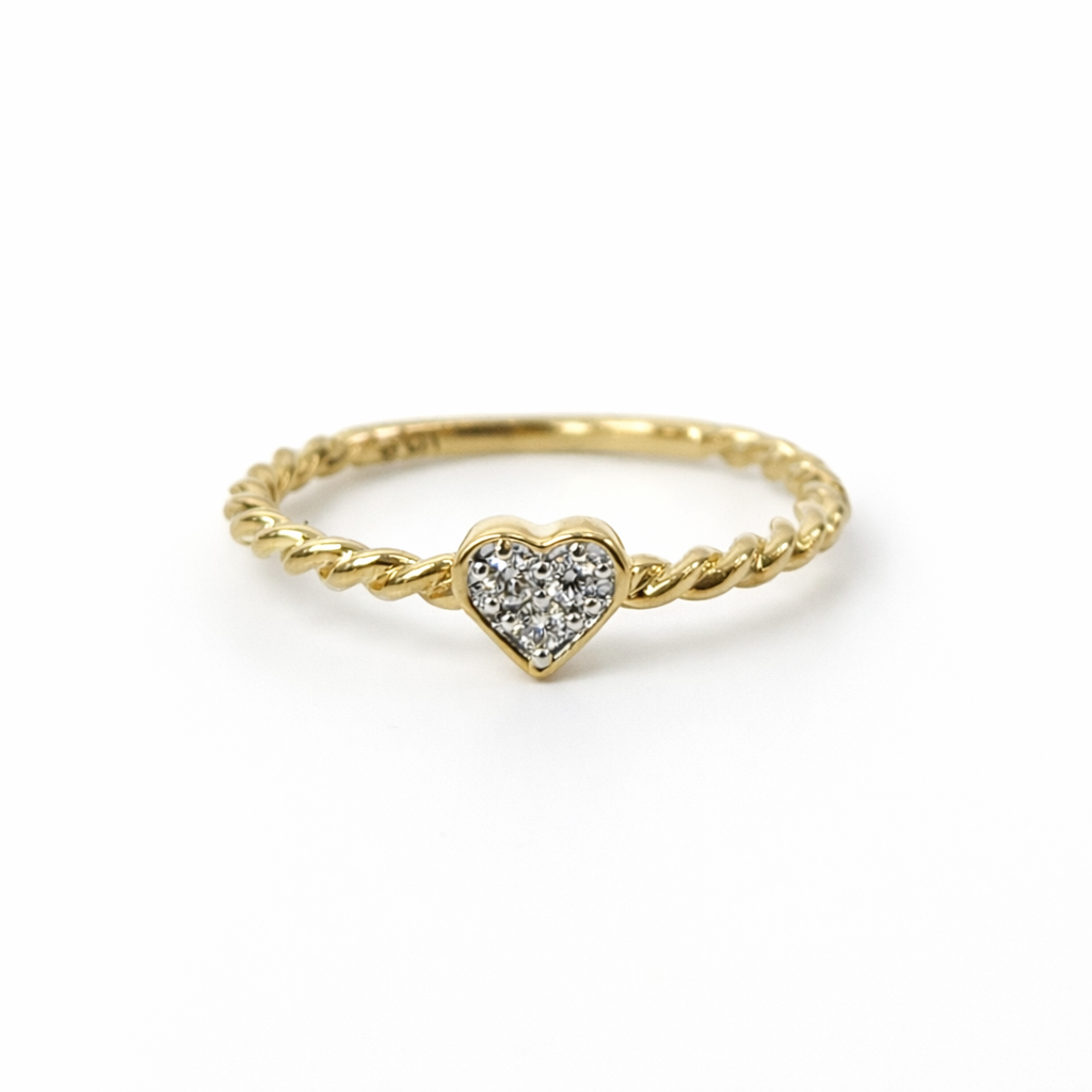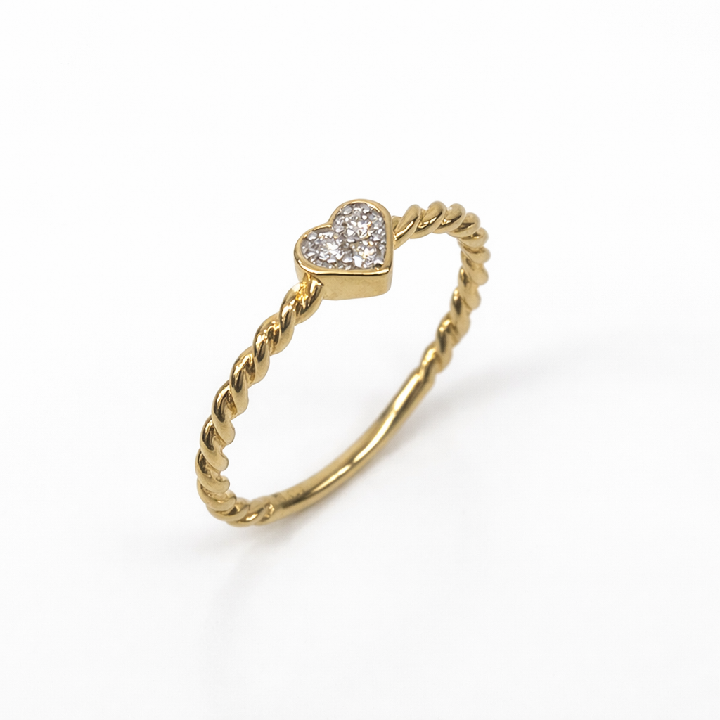 The heart setting is seamlessly integrated into a beautifully crafted twist rope-style band, adding texture and dimension to the ring. The twisted design reflects light along its curves, complementing the sparkle of the diamonds while giving the ring a modern yet timeless appeal. The band is fine and elegant, making it perfect for stacking or wearing as a standalone statement.