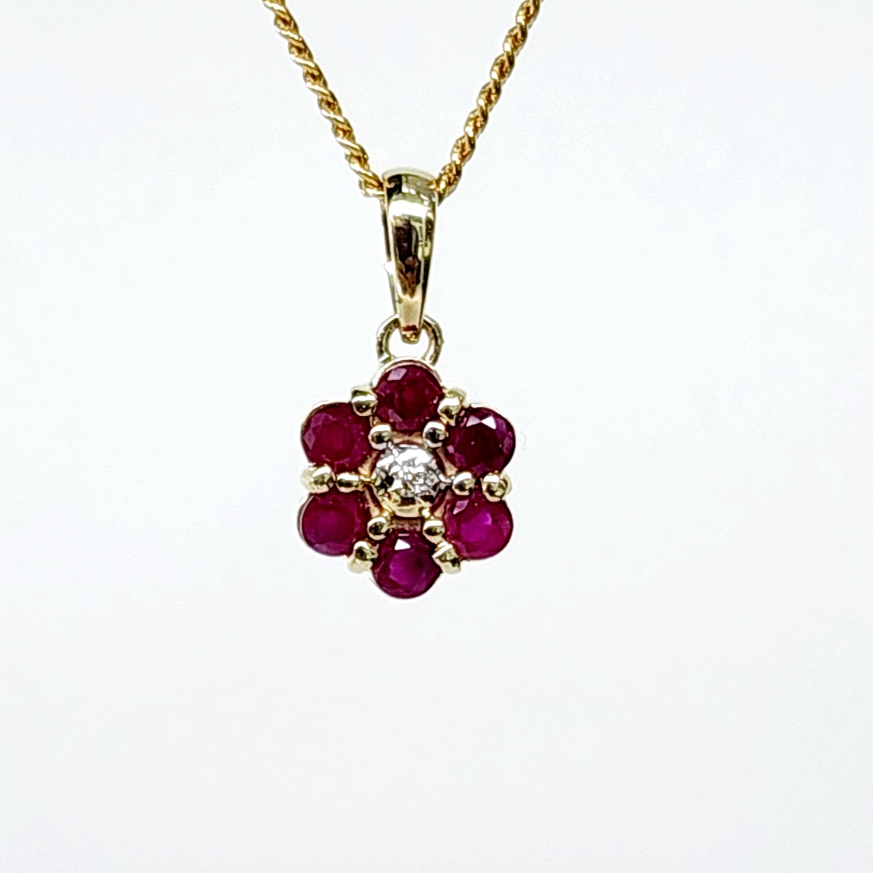This beautiful 9ct yellow gold pendant features a 0.59ct natural ruby cluster as the main gemstone. At the center of the cluster sits a 0.01ct diamond, adding a touch of brilliance to the piece. The pendant has a round shape with a diameter of 8.60mm, making it delicate yet noticeable.