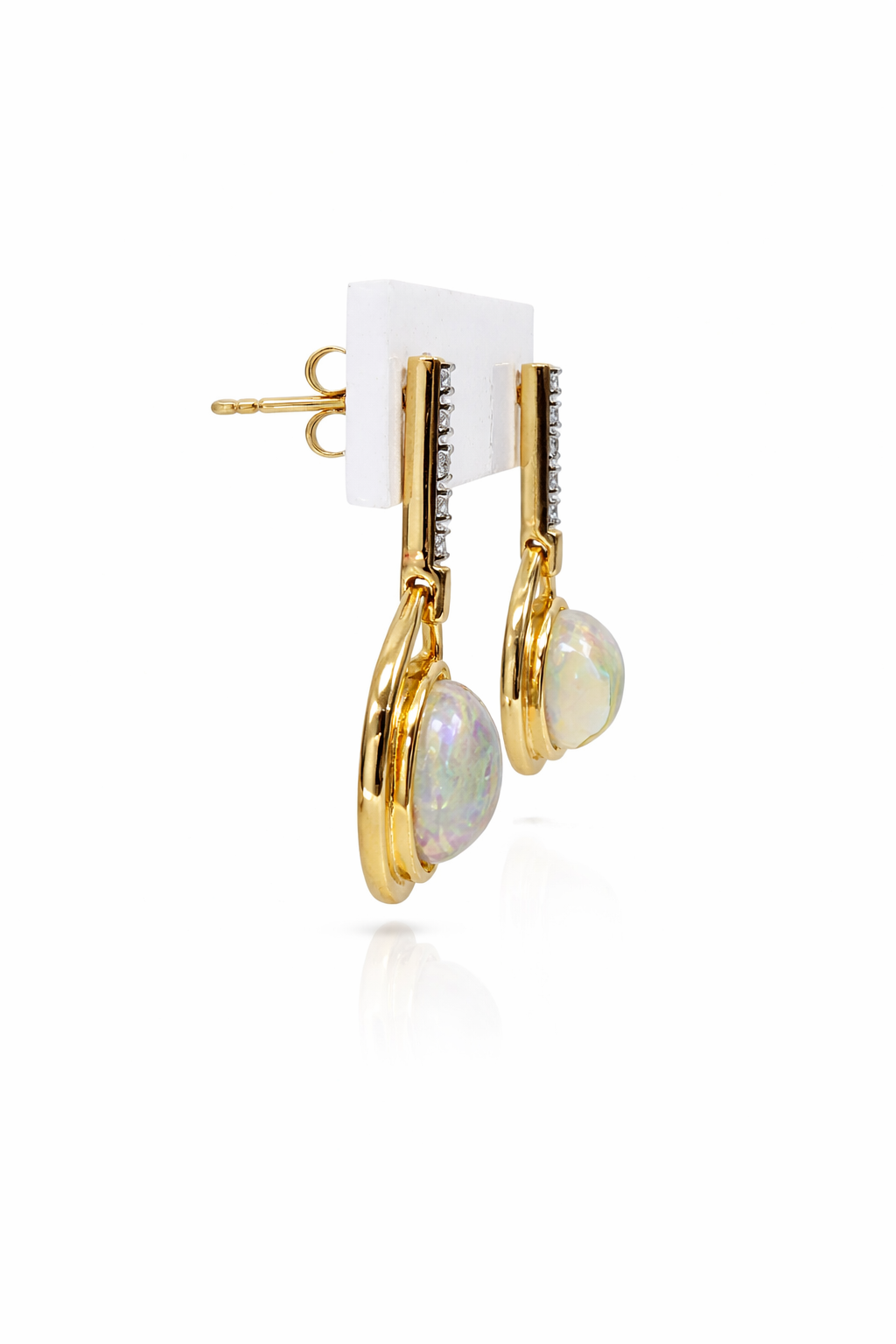 9ct Yellow Gold Opal & Diamond Drop Earrings – 7mm Round Opal, 20mm Drop – IE1502