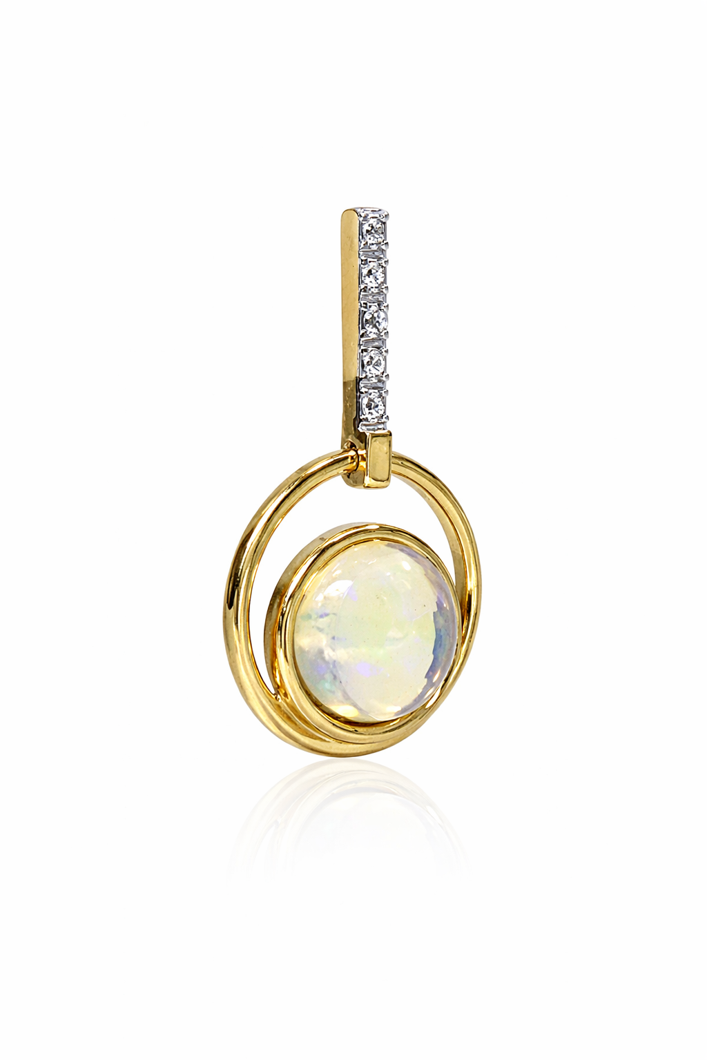 Add a touch of timeless elegance with these beautifully crafted 9ct Yellow Gold Opal & Diamond Drop Earrings. Designed with a modern circular drop style, these earrings feature a luminous 7mm round half-round opal that displays subtle flashes of colour and brilliance.