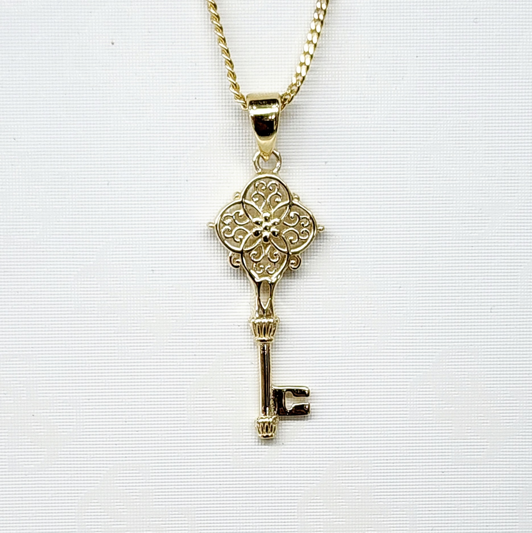 Delicate detail key pendant with open filigree cut out at top. Measures 10mm wide x 23mm tall + bail.