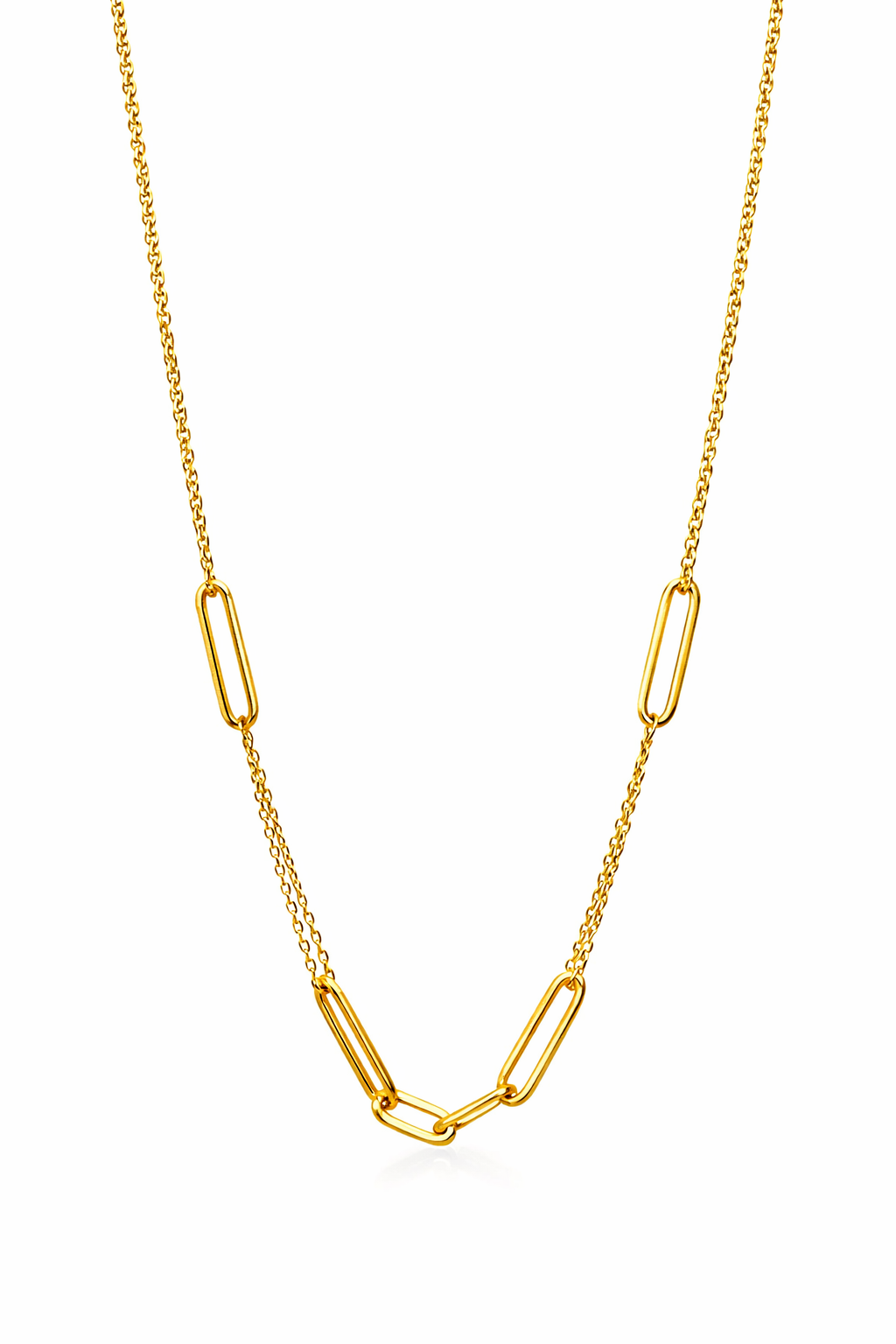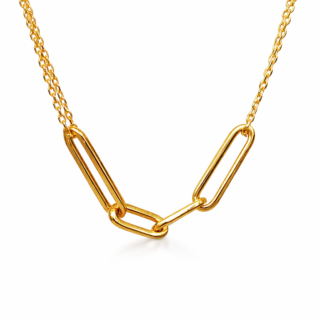Expertly made in radiant 9ct yellow gold, the necklace showcases a delicate yet durable double chain structure. The fine trace links provide a subtle shimmer, while the polished elongated paperclip links are strategically placed to add dimension, movement, and a modern edge to the design. The contrast between the fine chains and bold links creates a balanced aesthetic that is both eye-catching and versatile.