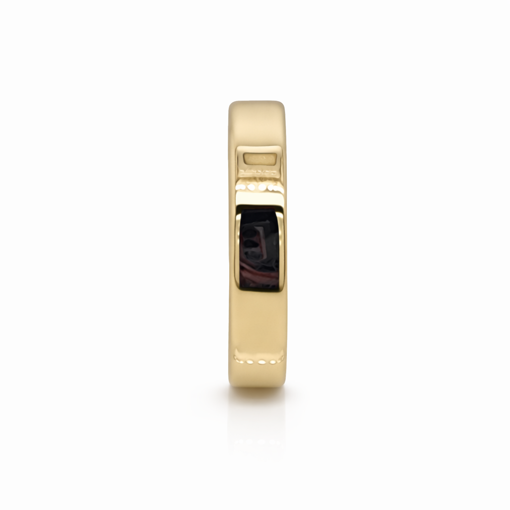 Measuring 5mm in width and 1.00mm in thickness, this band provides a comfortable, low-profile fit ideal for everyday wear. The polished finish enhances the natural warmth of the yellow gold, while the subtle bevelled edges add definition and sophistication without overpowering the minimalist style.