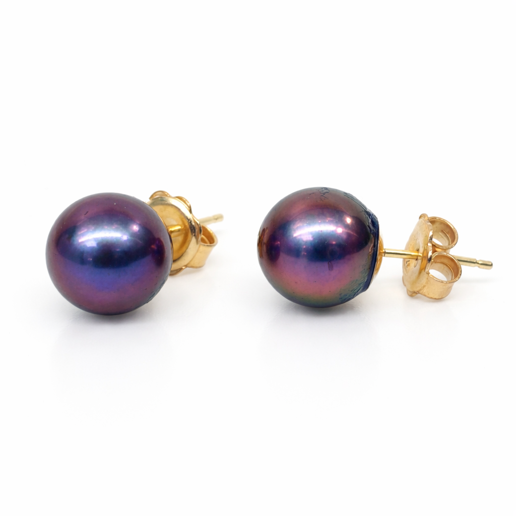 Enhance your jewellery collection with these timeless 9ct Yellow Gold Tahitian Black Pearl Stud Earrings, crafted to showcase the natural beauty of genuine Tahitian pearls. Featuring a perfectly matched pair of 9.50mm round pearls, these earrings display a luxurious rich peacock body colour with striking strong purple overtones, creating a captivating iridescent glow from every angle.