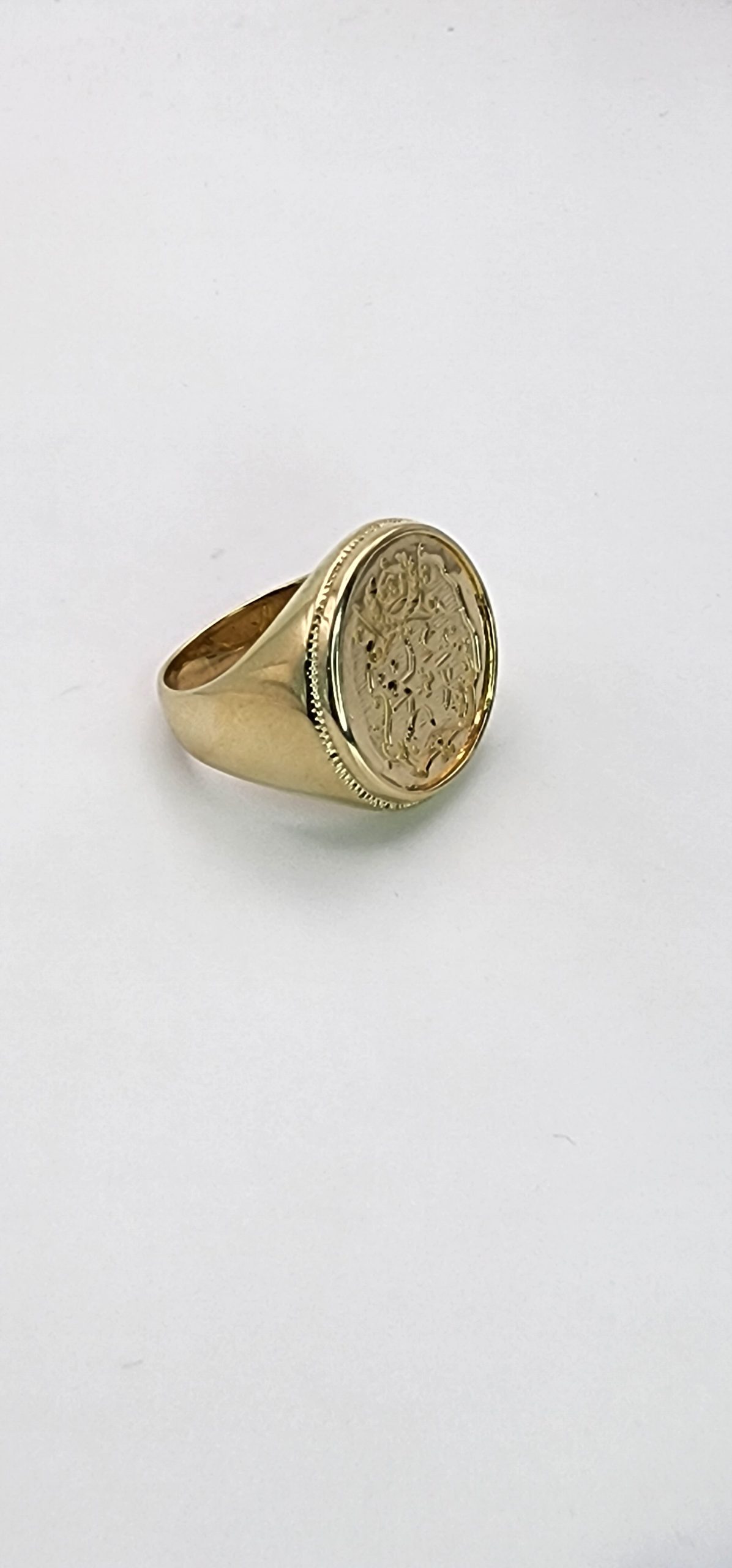 The ring is made out of solid 9ct yellow gold with 9ct gold Tongan Sila coin inserted with rubover setting. The Tongan sila coin is same size a a full sovereign coin. The total weight of the ring is 14.55 grams