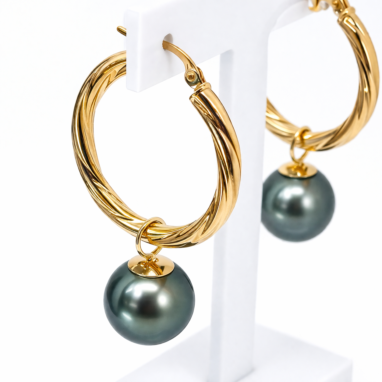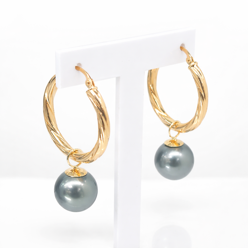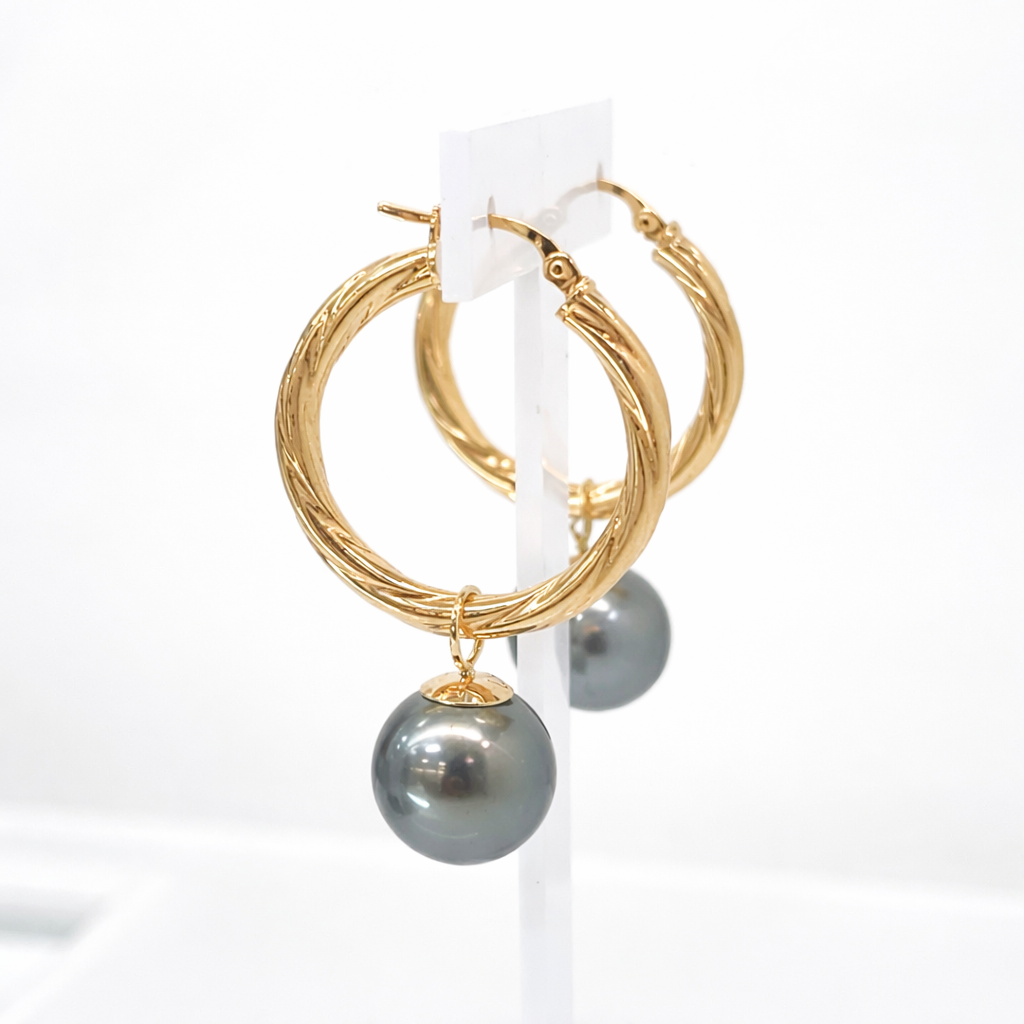 These earrings blend classic hoop styling with the exotic beauty of Tahitian pearls. The dark natural pearl tones create a luxurious statement, while the twisted gold hoops add texture and brilliance. Ideal as a gift or signature personal piece.