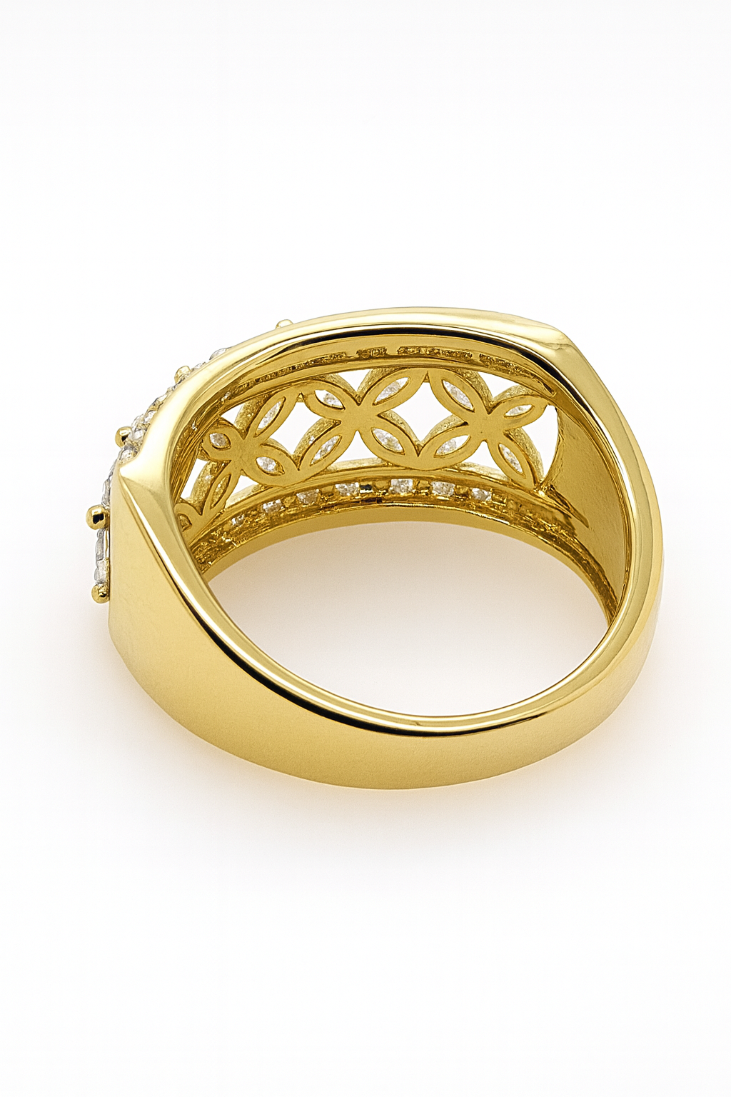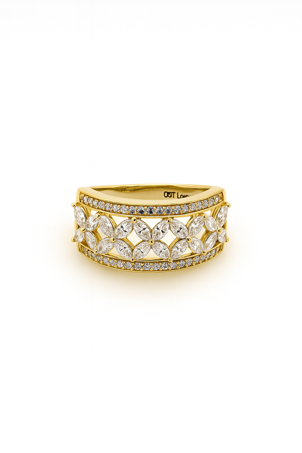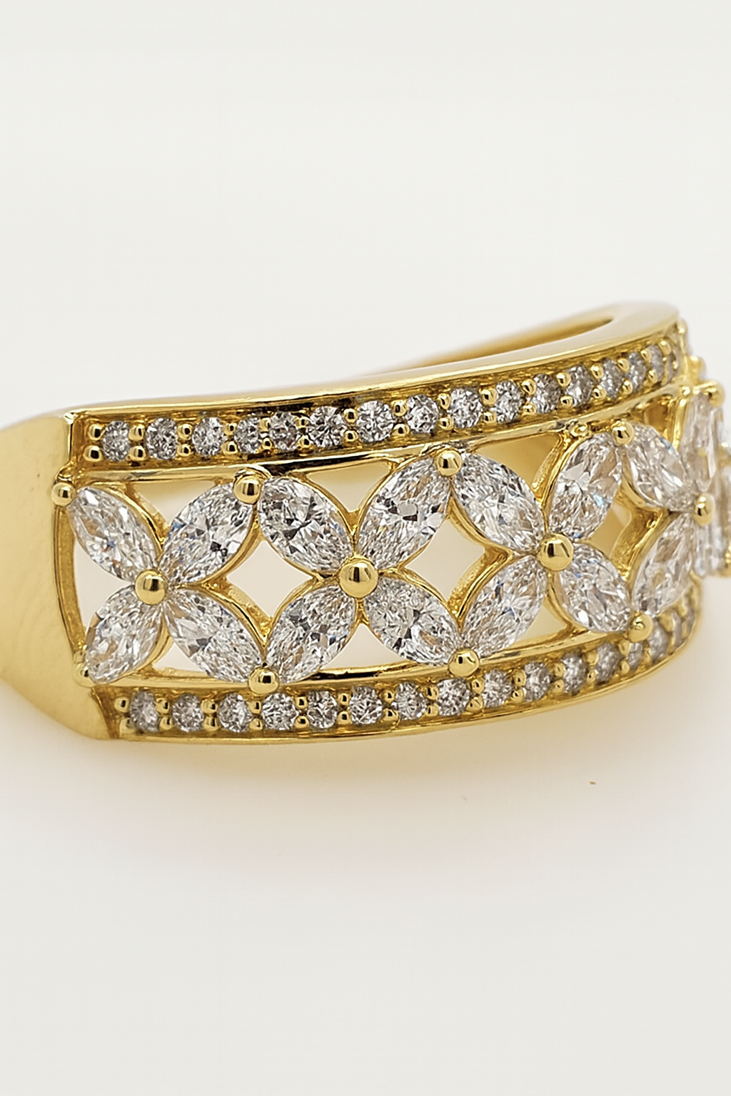 Make a bold statement with this luxurious 9ct yellow gold diamond band, featuring a total diamond weight of 1.04ct. The diamonds are E/F colour with VS clarity, offering exceptional sparkle and brilliance. The top of the band measures an impressive 9.25mm in width and showcases a beautifully balanced design: two parallel rows of round diamonds, each individually secured in classic 4-claw settings, with marquise-cut diamonds set in between like shimmering stars or delicate flower petals, held in elegant 2-claw settings.