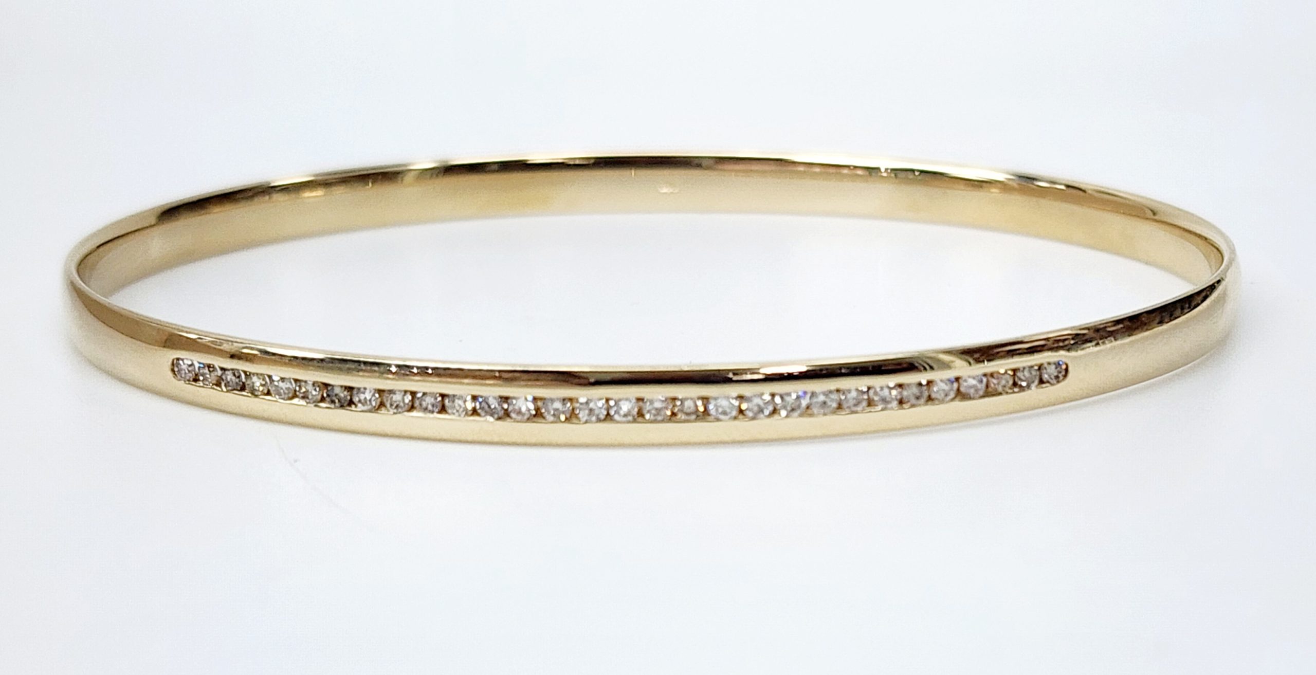 Make a striking impression with this exquisite bangle, designed to capture attention and elevate any look. Crafted from 9kt solid yellow gold, this piece is adorned with a total weight of 0.70 carats of dazzling diamonds, channel-set for a seamless and radiant finish. The diamonds are arranged in a way that enhances the bangle’s shimmering glow, adding a touch of refined luxury to your style. Measuring 4.40mm in width, with an internal size of 67mm by 57mm, this bangle offers a comfortable fit while maintaining its elegant form. Its minimal yet sophisticated design is perfect for adding a touch of glamour to any celebration, ensuring that you shine brightly on every special occasion.