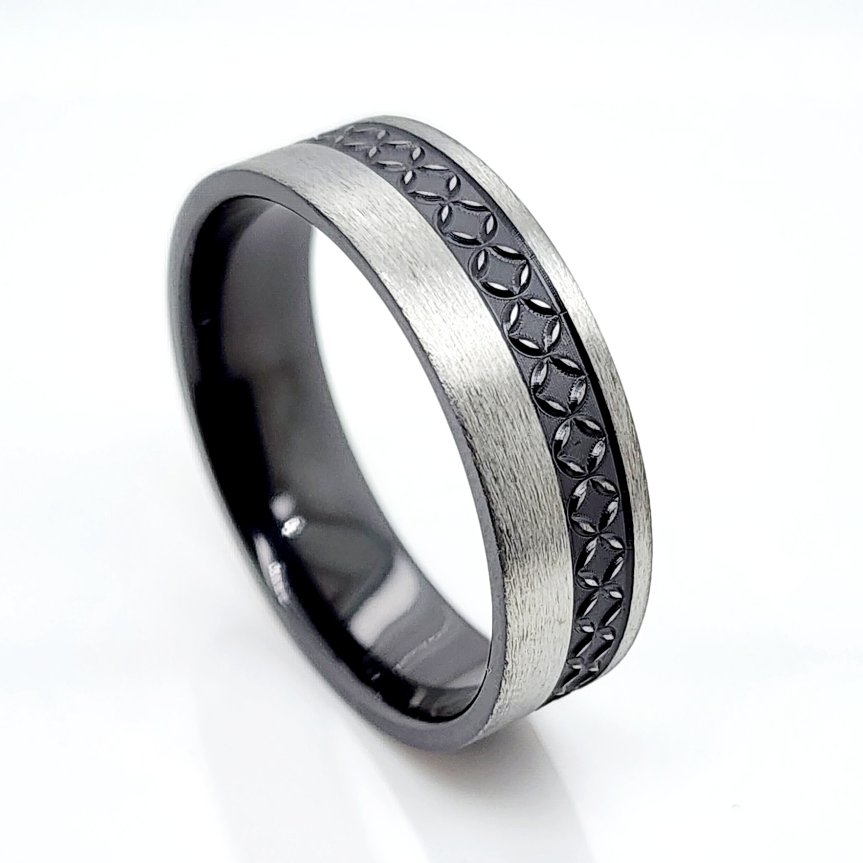 Black Zirconium Band 7mm Wide with Polynesian Inspired Patterns Engraved