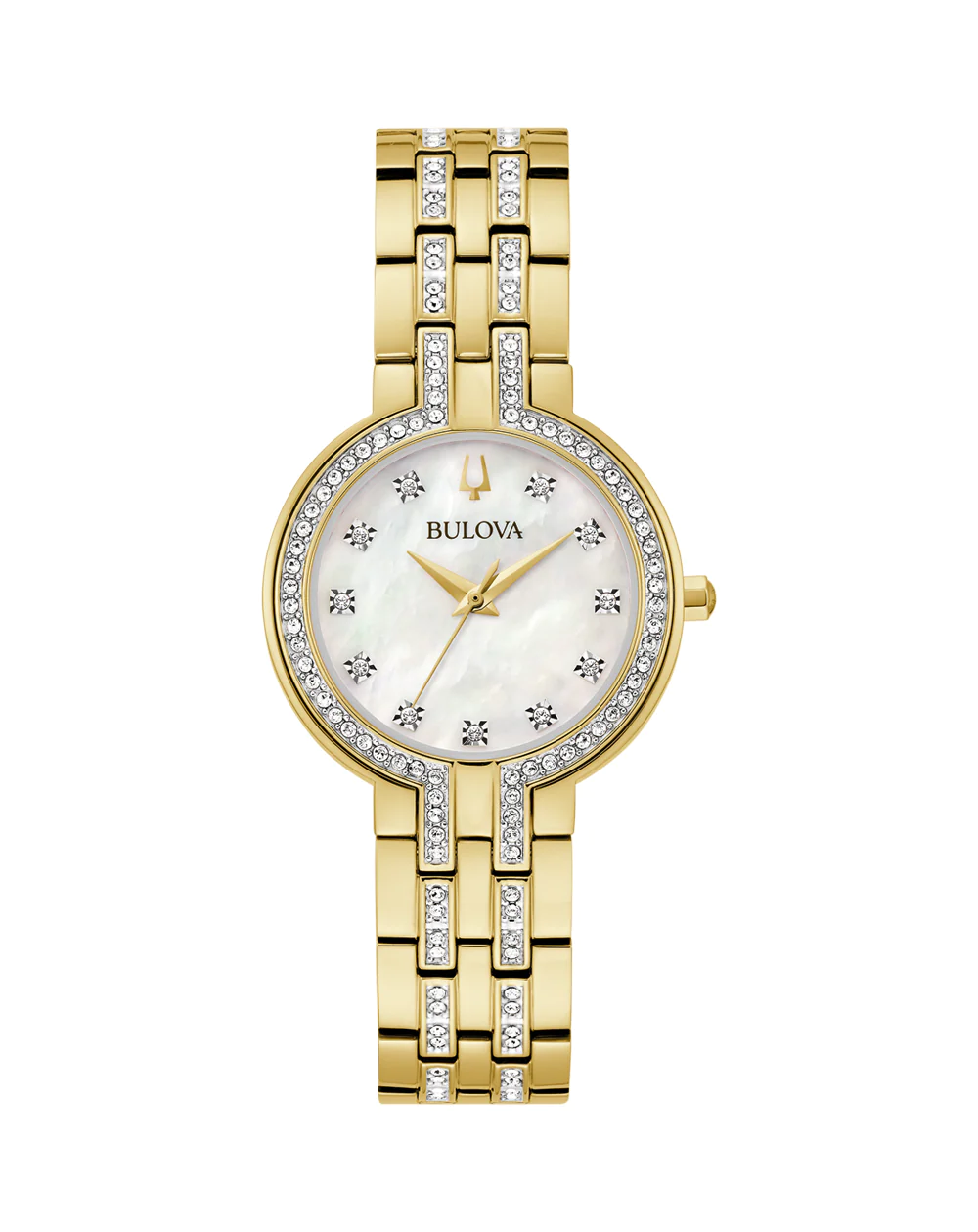 Contemporary design meets upscale refinement with this Bulova ladies? box set from the crystal collection. The polished gold-tone stainless steel case is carefully set with 68 crystals, creating a graceful outline that traces the matching bracelet with a further 48 striking crystals.