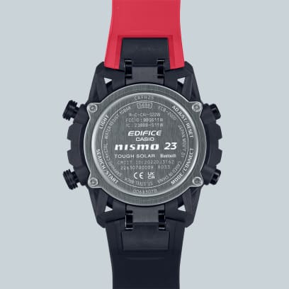 This sophisticated Model Year 2023 design brings the eye-catching features of the Nissan Z #23 Super GT racer to the EDIFICE timepiece. This bold use of red and black across the watch is inspired by the red to black shift from front to rear across the Nissan Z #23. The 23-minute position is highlighted with a special ?23? in a further nod to the NISMO ace, and the ?Z? logo appearing on the car?s rear fender is incorporated into the dial design using actual graphic data from NISMO. The bezel, band loop, and case back are engraved with the NISMO logo, for a very special limited edition that honors the NISMO racing car through and through.
