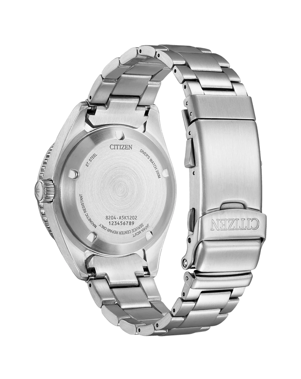 An enticing fusion of precision, durability and stylish design elements, this watch reflects meticulously considered craftsmanship in the pursuit of enduring quality. This diver watch is a new member of the Citizen Mechanical Collection. Constructed with an automatic movement and Stainless steel case and bracelet. Featuring day and date display, 200WR and a rich blue dial, is a reflection of style. WR200 ISO 6425 approved for diving.