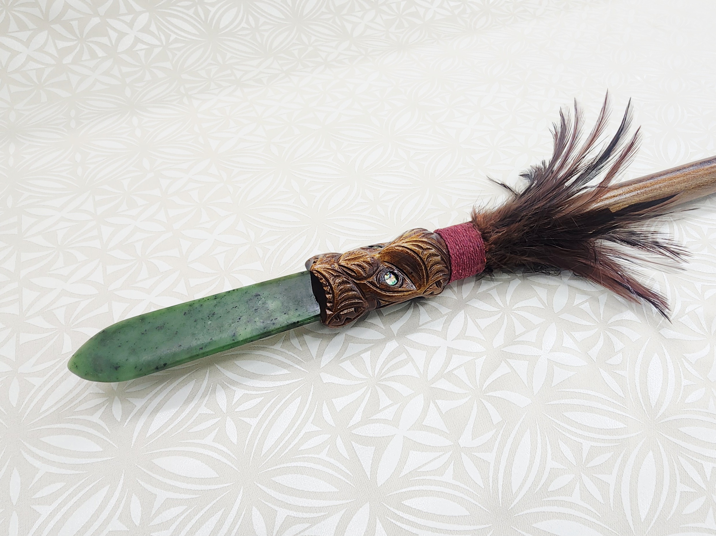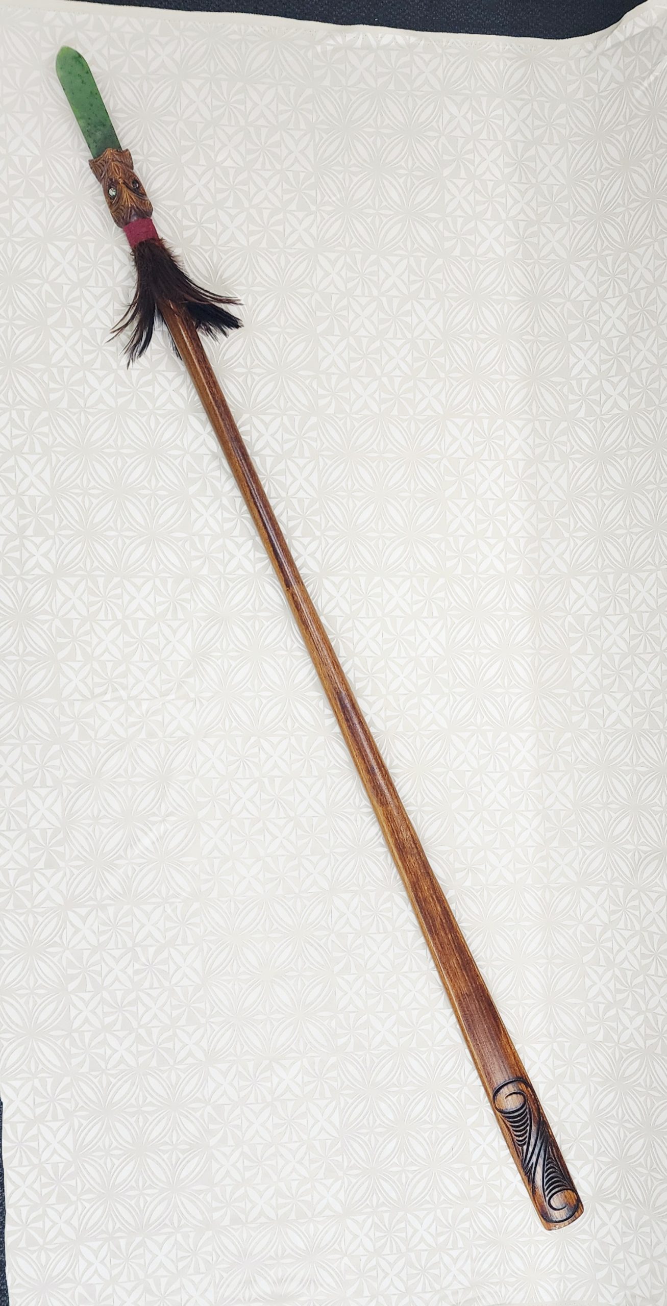 This full size Maori Taiaha is made even more stunning with the addition of a pounamu greenstone tongue. This piece has Paua inlay set in the eyes and feathers decorated just below the head. The rau is the end of the taiaha and is 6cm wide.