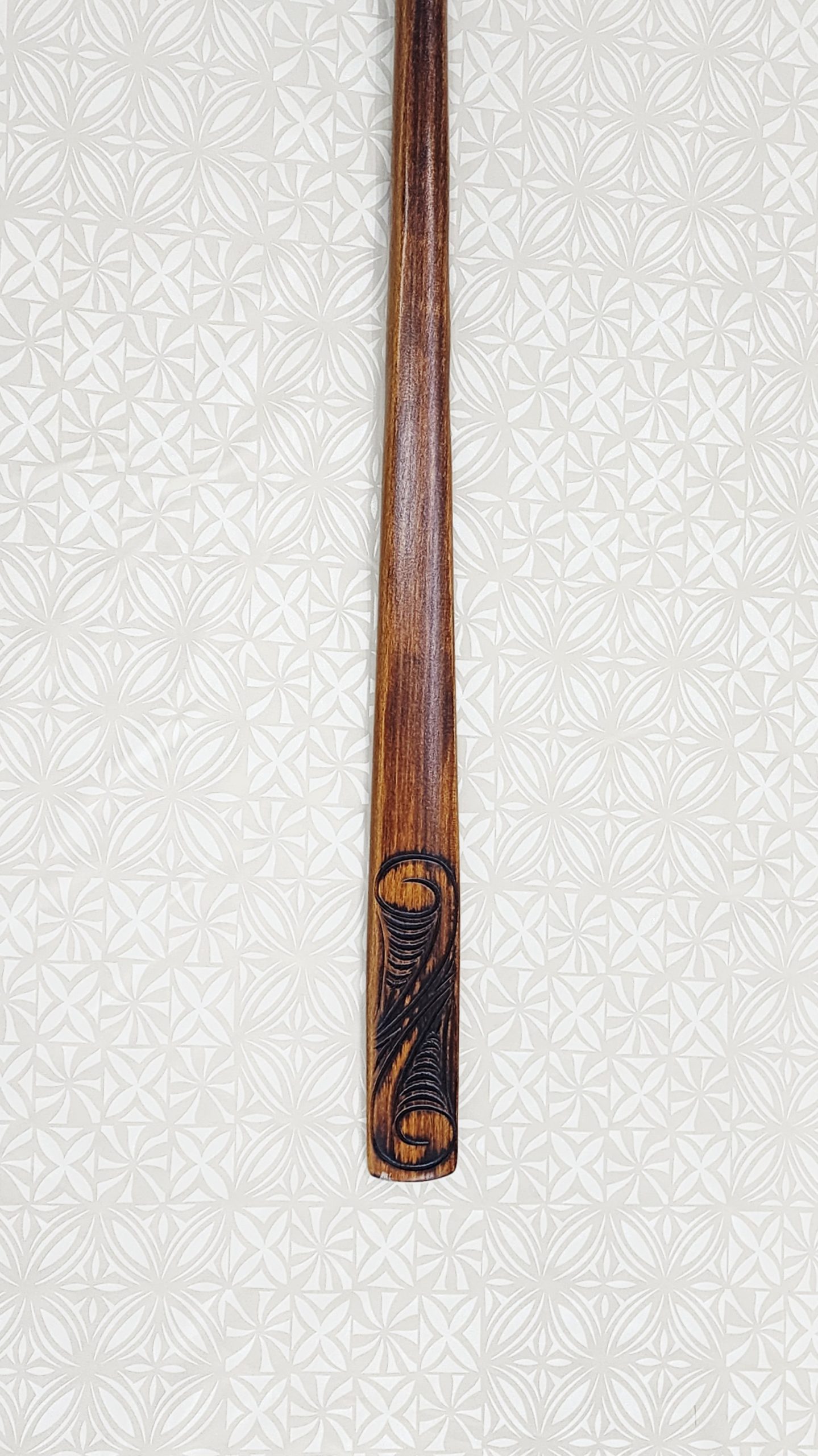 Just like the traditional Taiaha, this replica Taiaha is carved the same on both sides. Feathers decorate the shaft just below the head