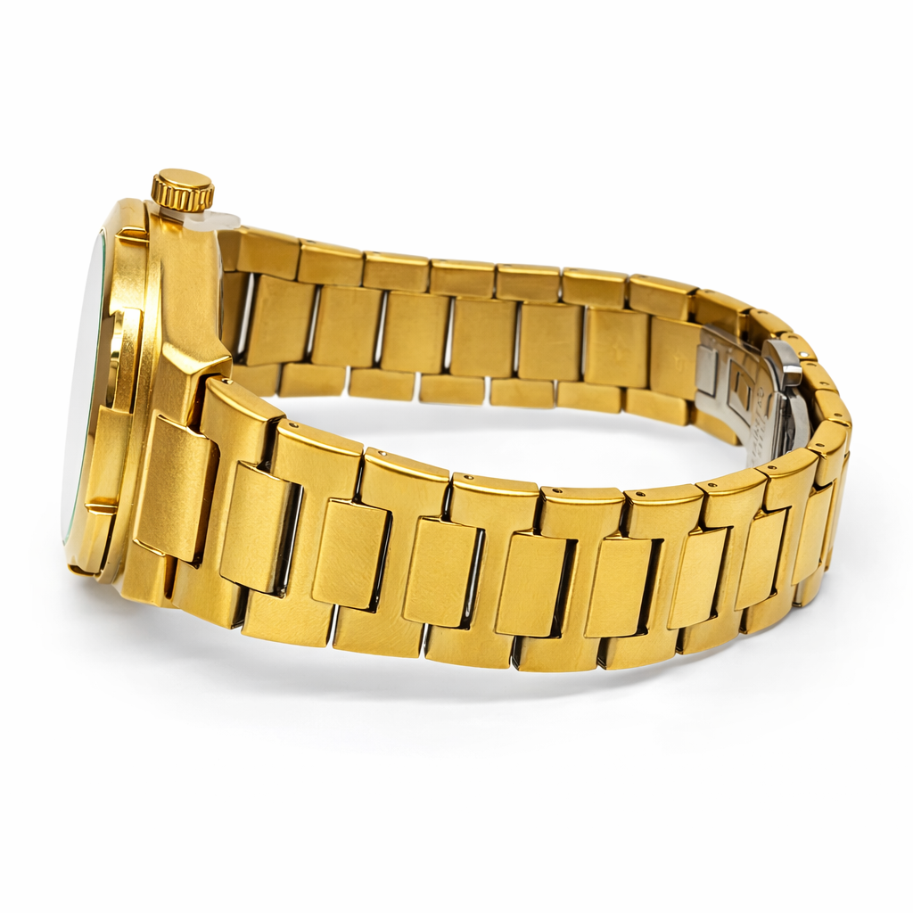 This striking timepiece features a rich deep blue sunburst dial, beautifully contrasted against a luxurious gold-tone stainless steel case and bracelet, delivering a premium and eye-catching finish. The clean dial layout is enhanced with luminous hands and hour markers, ensuring clear visibility even in low-light conditions.