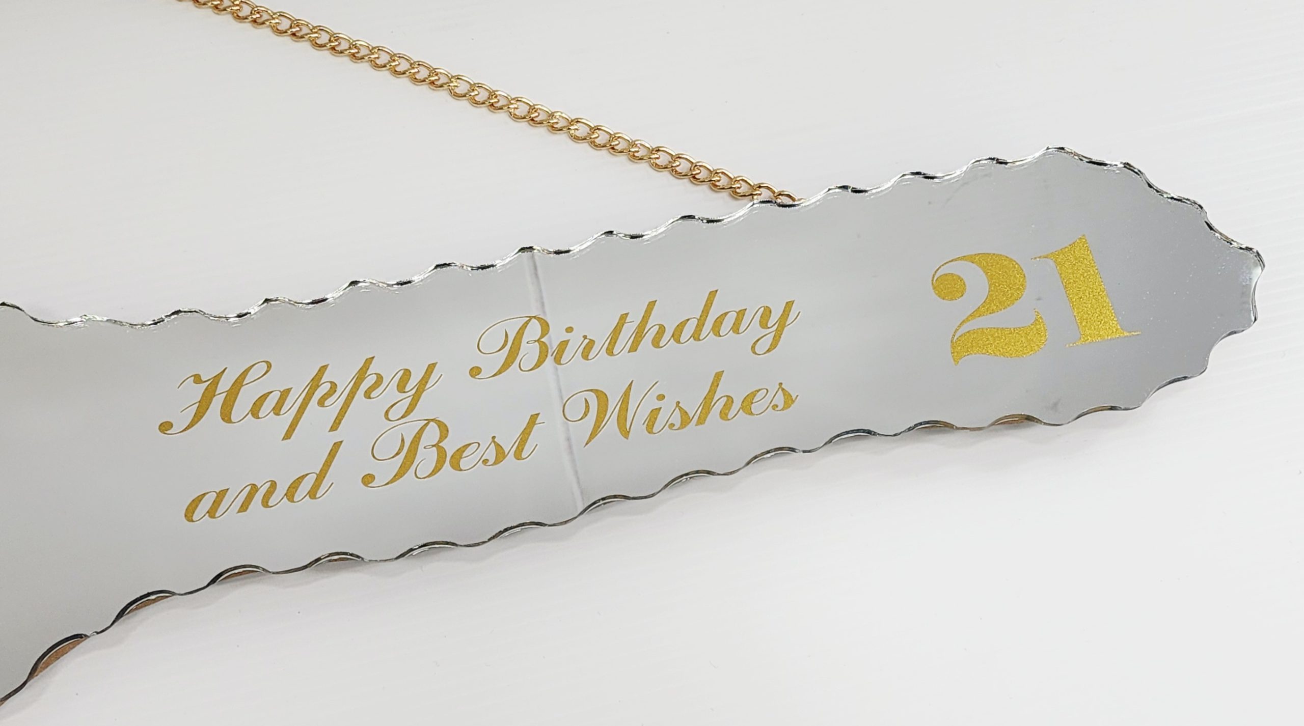 Our Mirrored 21st keys come with a 13mm MDF backing so your key can be signed by guests and loved ones. They also feature scalloped edges and a gold look chain to hang from. Dimensions: 524 x 205mm.