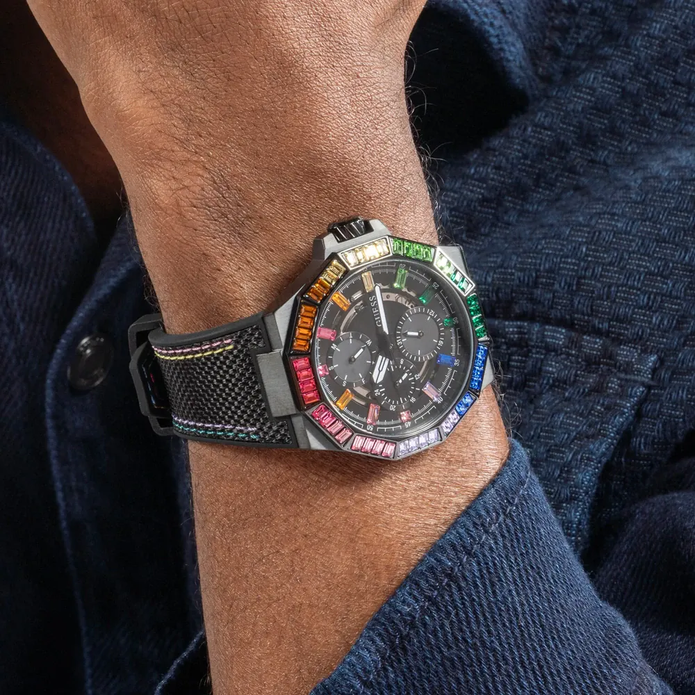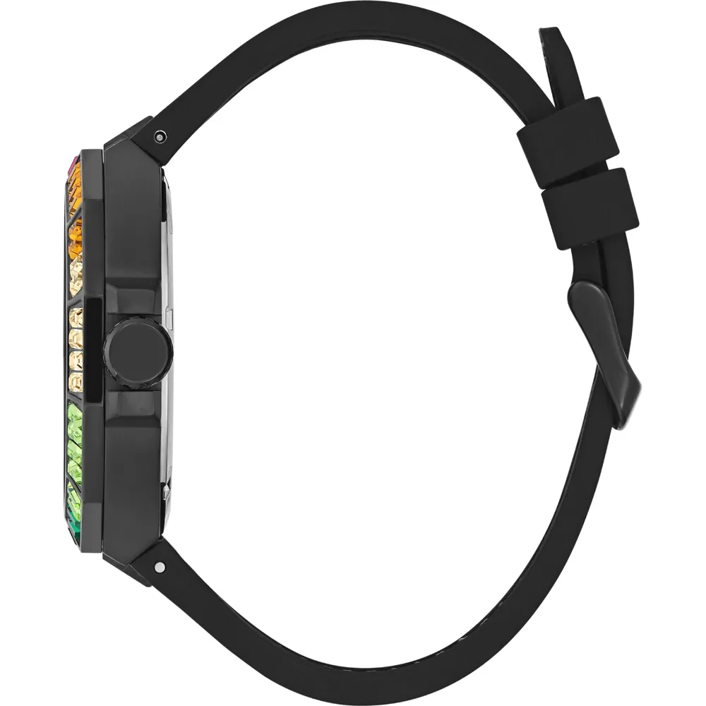 This Guess watch has a stainless steel case with a diameter of 45 mm and is fitted with a rubber strap