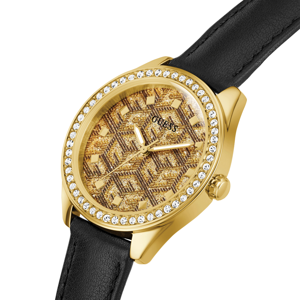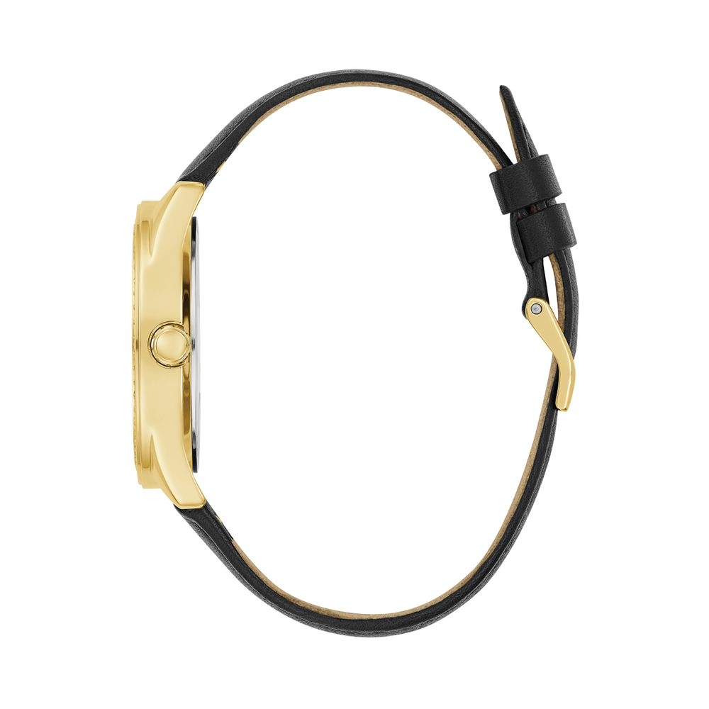 Black and gold combine on this must have spring timepiece. Featuring a fully crystal case paired with our signature Quattro G pattern with a smooth black leather strap.