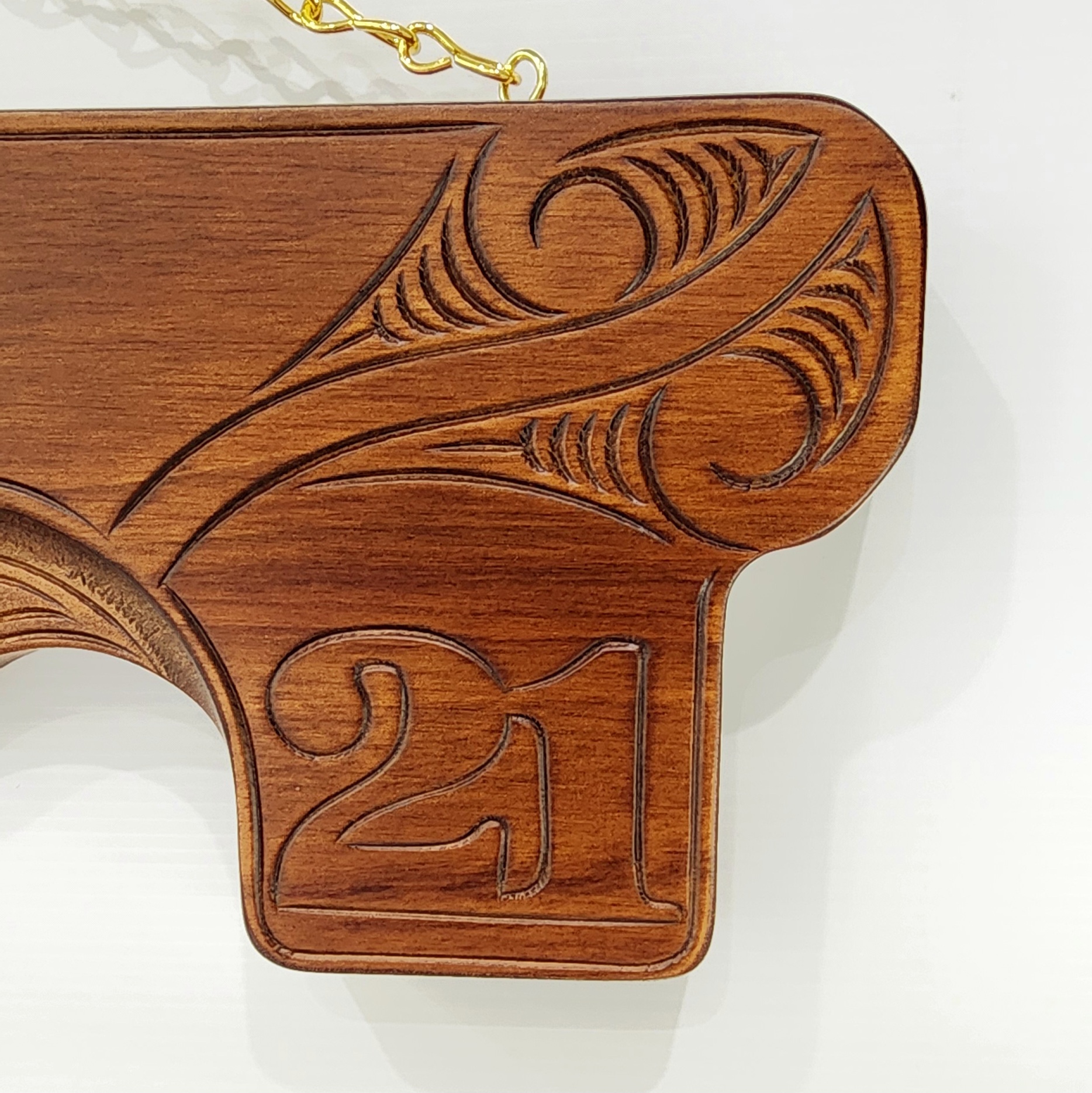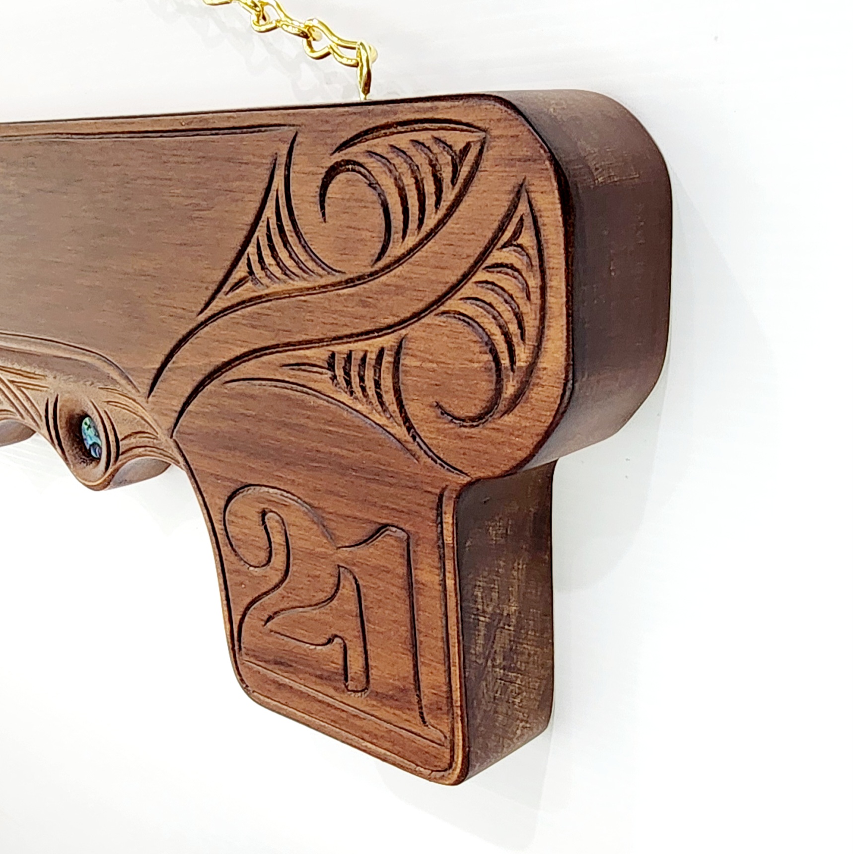 Additionally, this key can be personalized with the recipient’s name, which can be engraved into the wood. If you would like this option, simply select the “Engraved Key” option and provide the name in the designated box. The key also comes with a golden chain, making it ready to hang and display. With its Maori design, manaia carving, and handcrafted details, this 21st birthday key is a timeless gift that will be cherished for years to come.