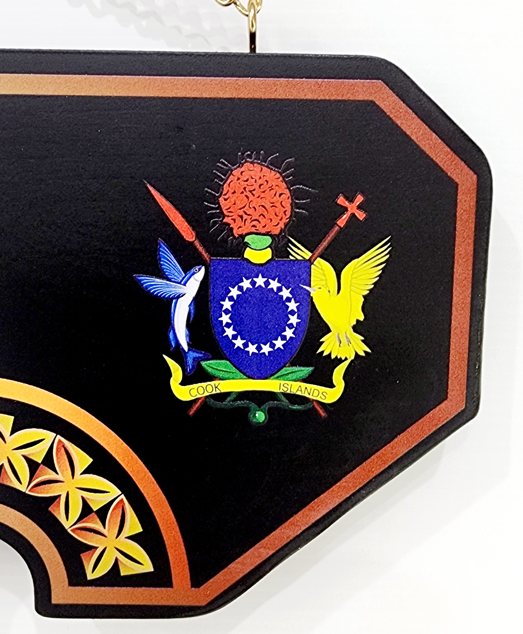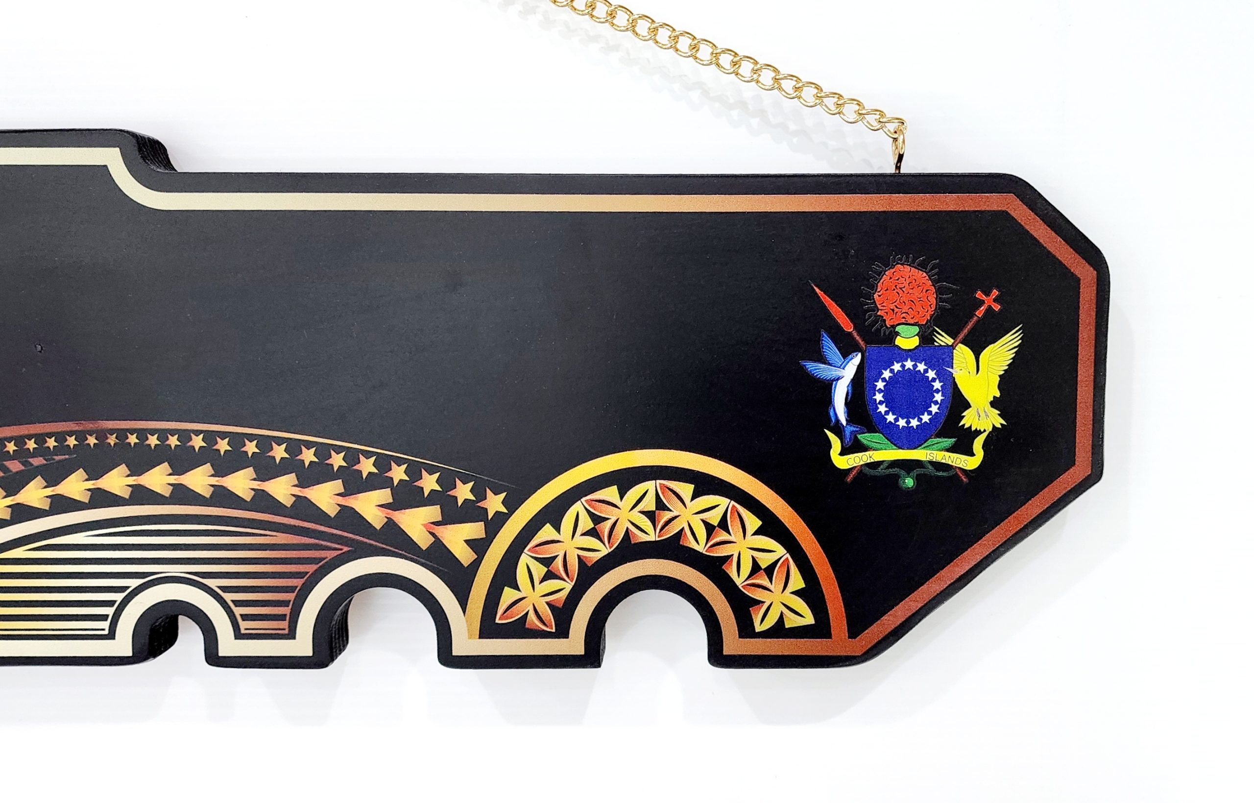 This birthday key is made out of solid timber with black base colour. On top of the black colour there is golden red theme UV printed island patterns with Coat of Arms of Cook Island on the far right hand side