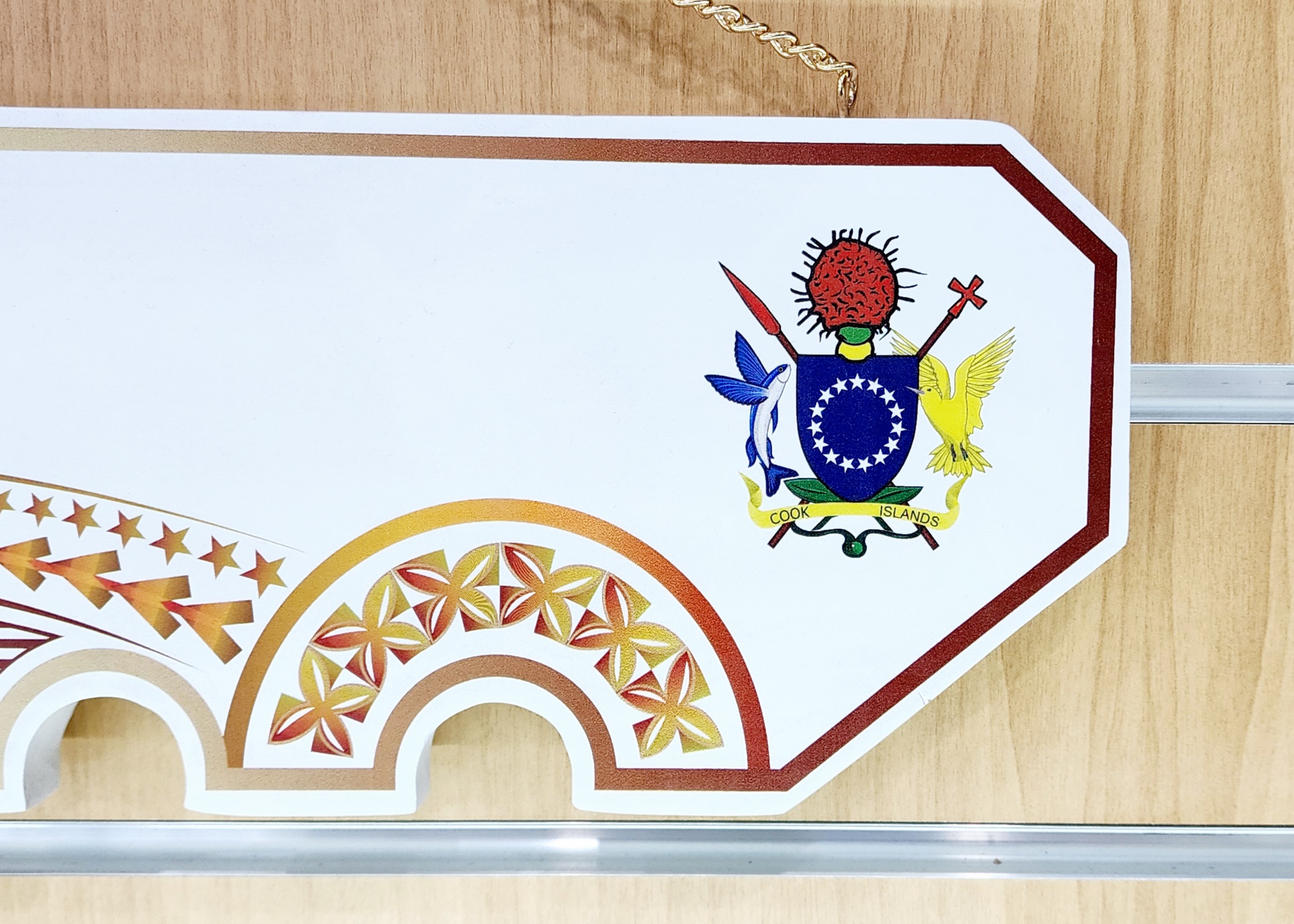 This birthday key is made out of solid timber with white base colour. On top of the white colour there is Golden Red Theme UV printed island patterns with Coat of Arms of Cook Island on the far right hand side.