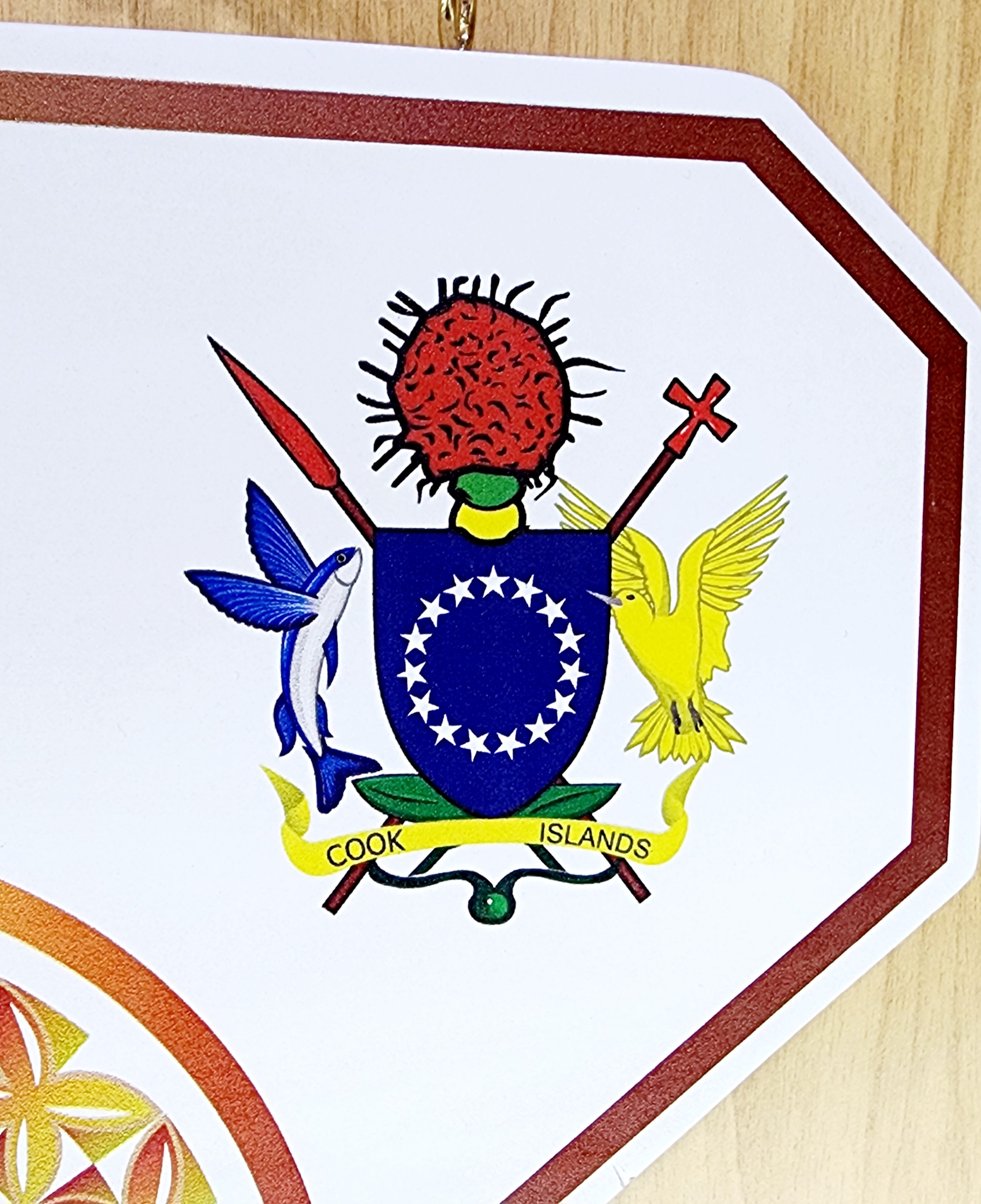 Island Design Golden Red Theme Colour UV Printed Birthday Key with Coat of Arms of Cook Islands