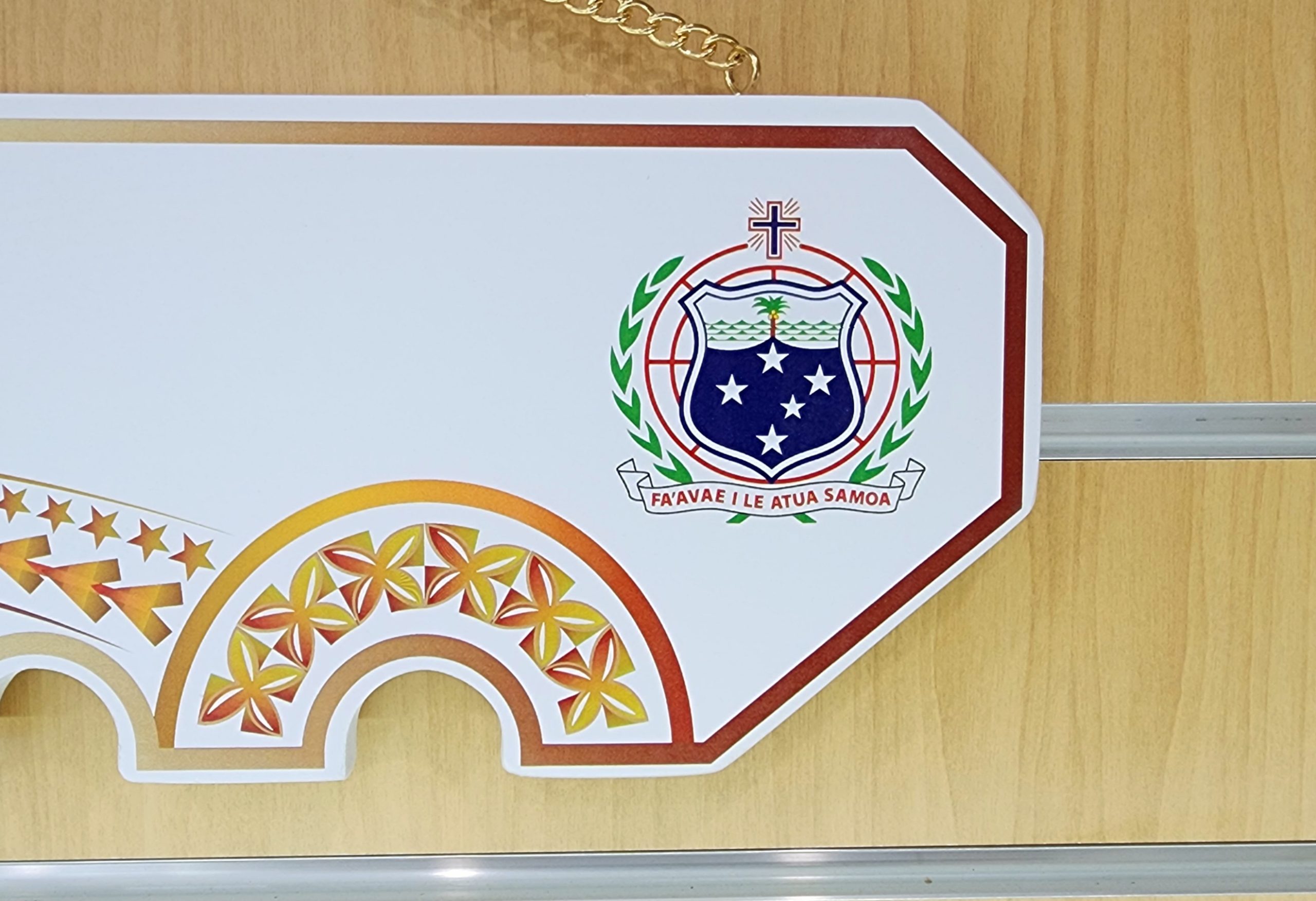 This birthday key is made out of solid timber with white base colour. On top of the white colour there is Golden Red Theme UV printed island patterns with coloured Samoan Sila on the far right hand side.