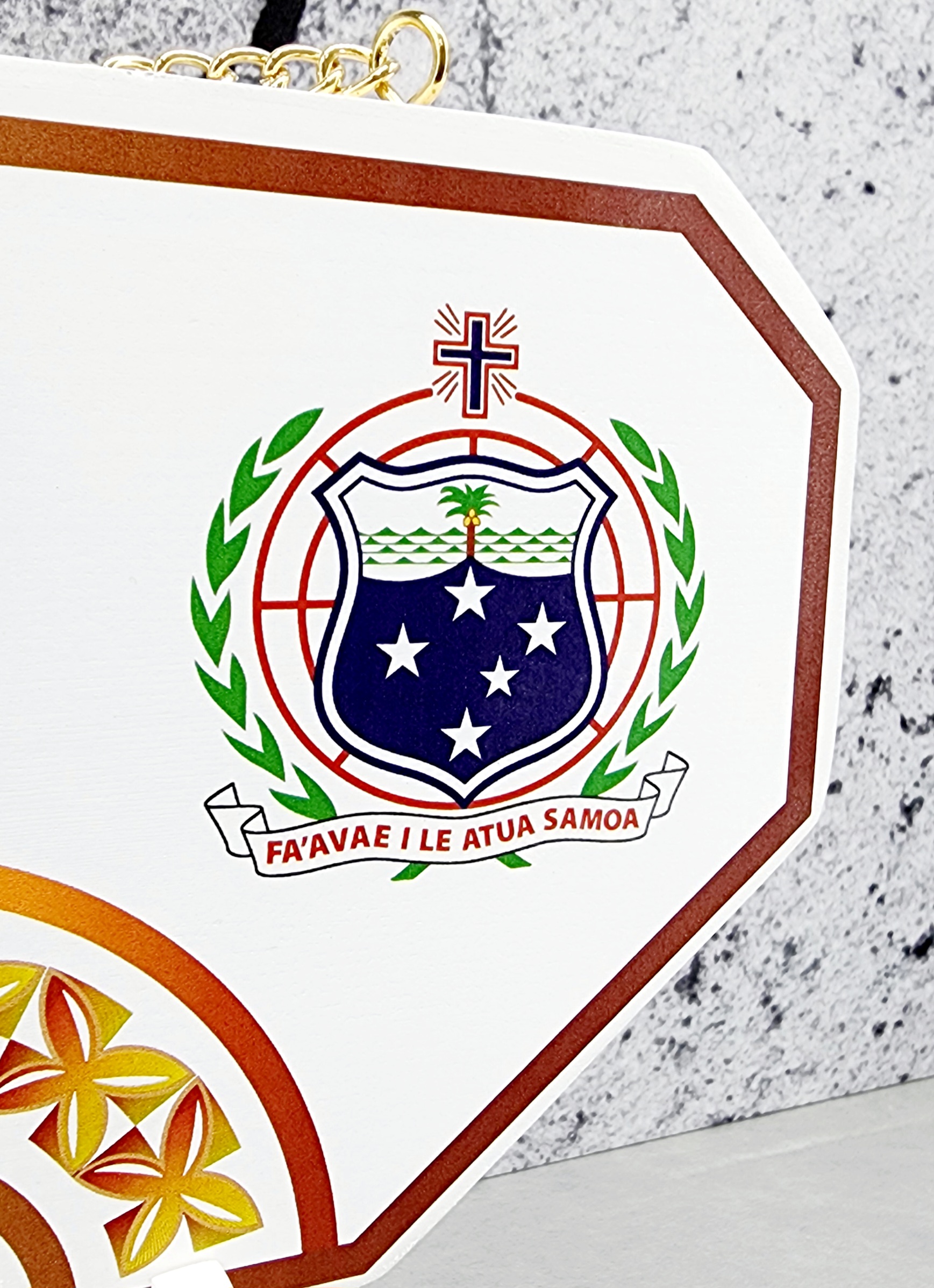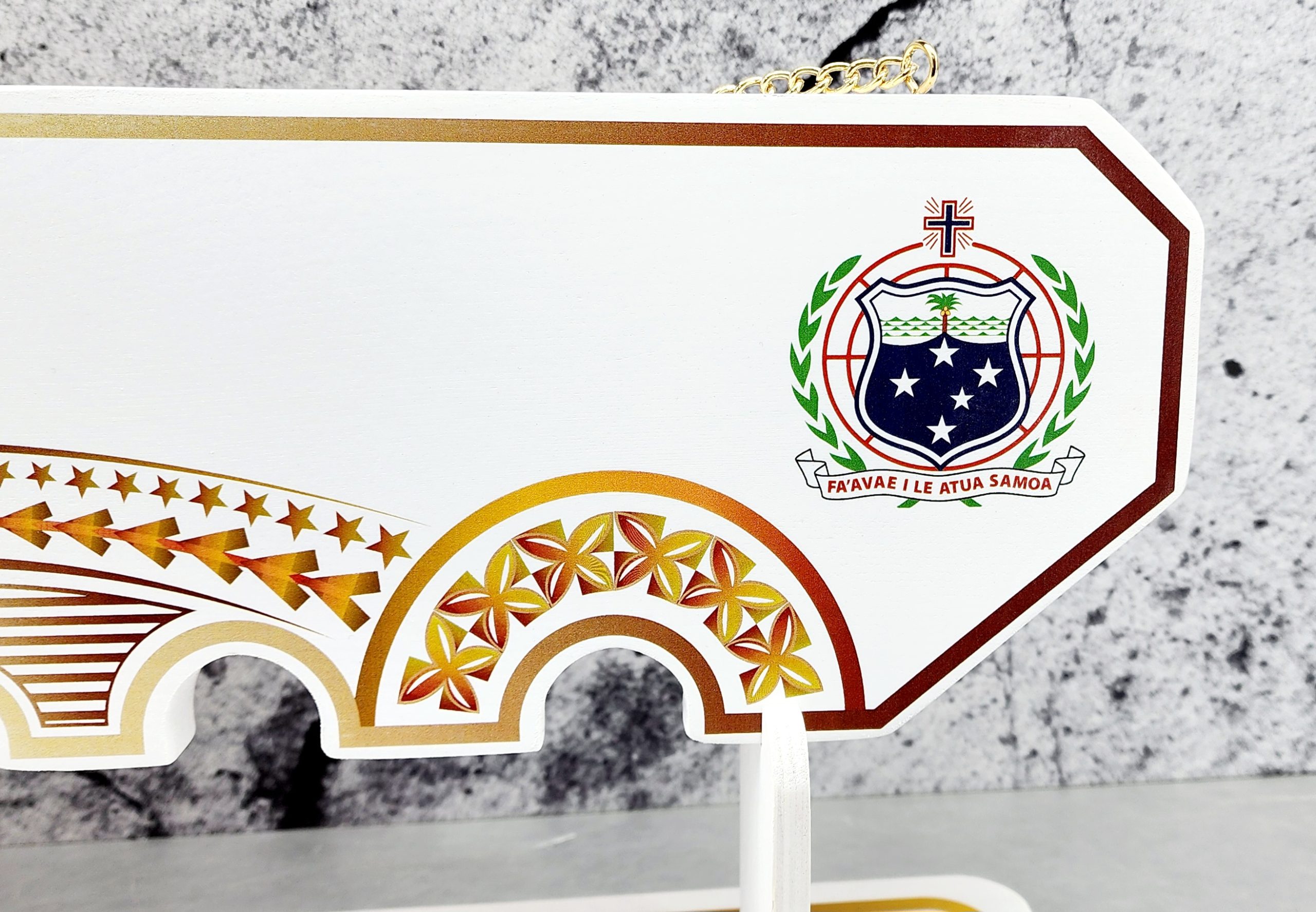 This birthday key is made out of solid timber with white base colour. On top of the white colour there is Golden Red Theme UV printed island patterns with coloured Samoan Sila on the far right hand side. The stand has also Golden Red colour theme border to match the key.