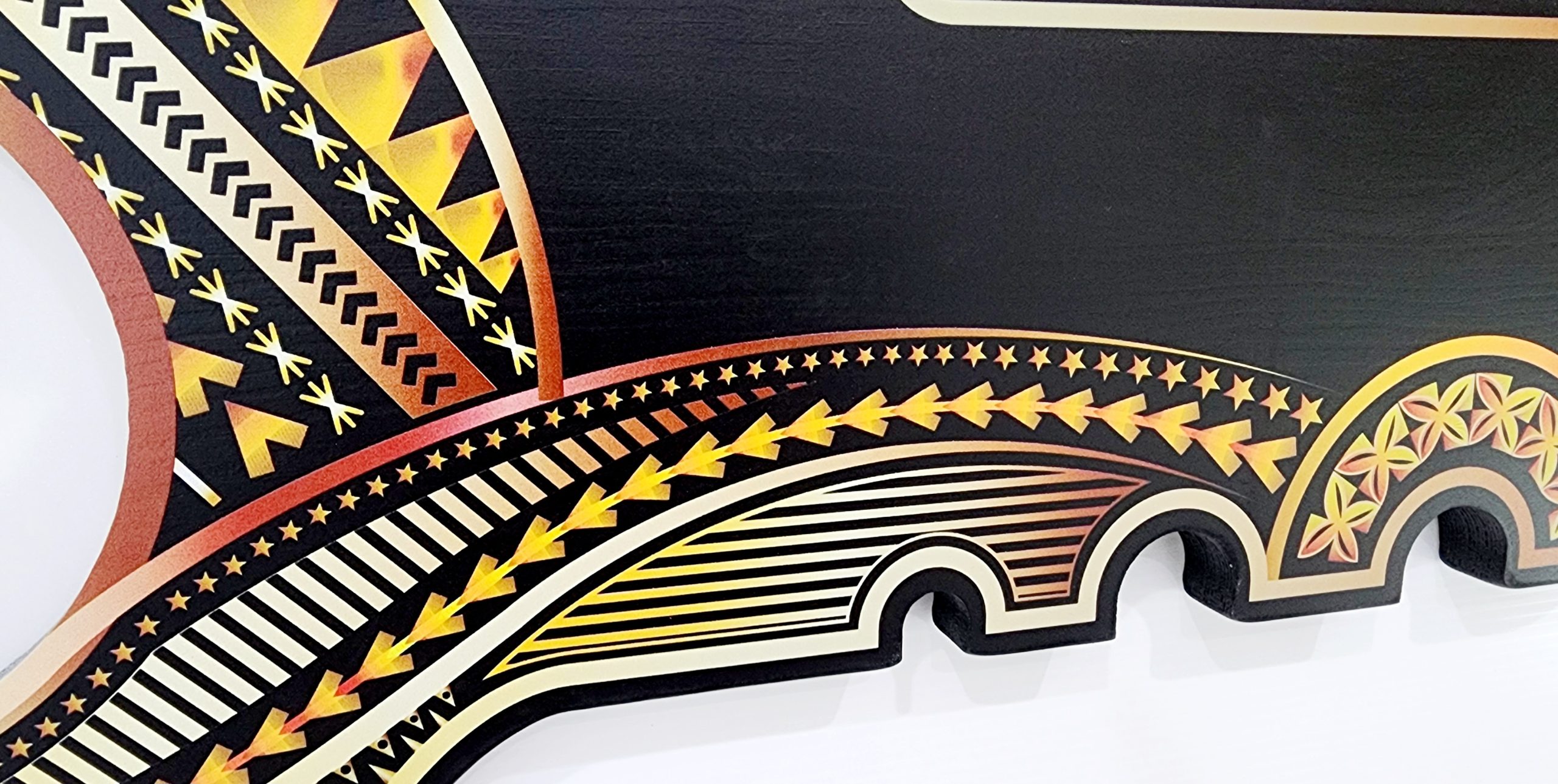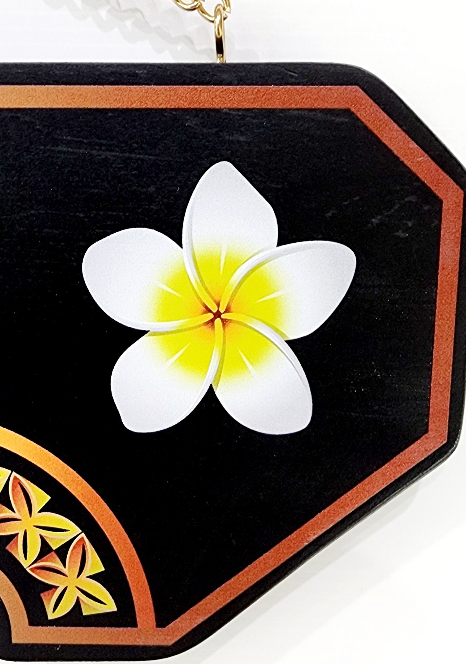 This birthday key is made out of solid timber with black base colour. On top of the black colour there is golden red theme UV printed island patterns with white frangipani flower on the far right hand side