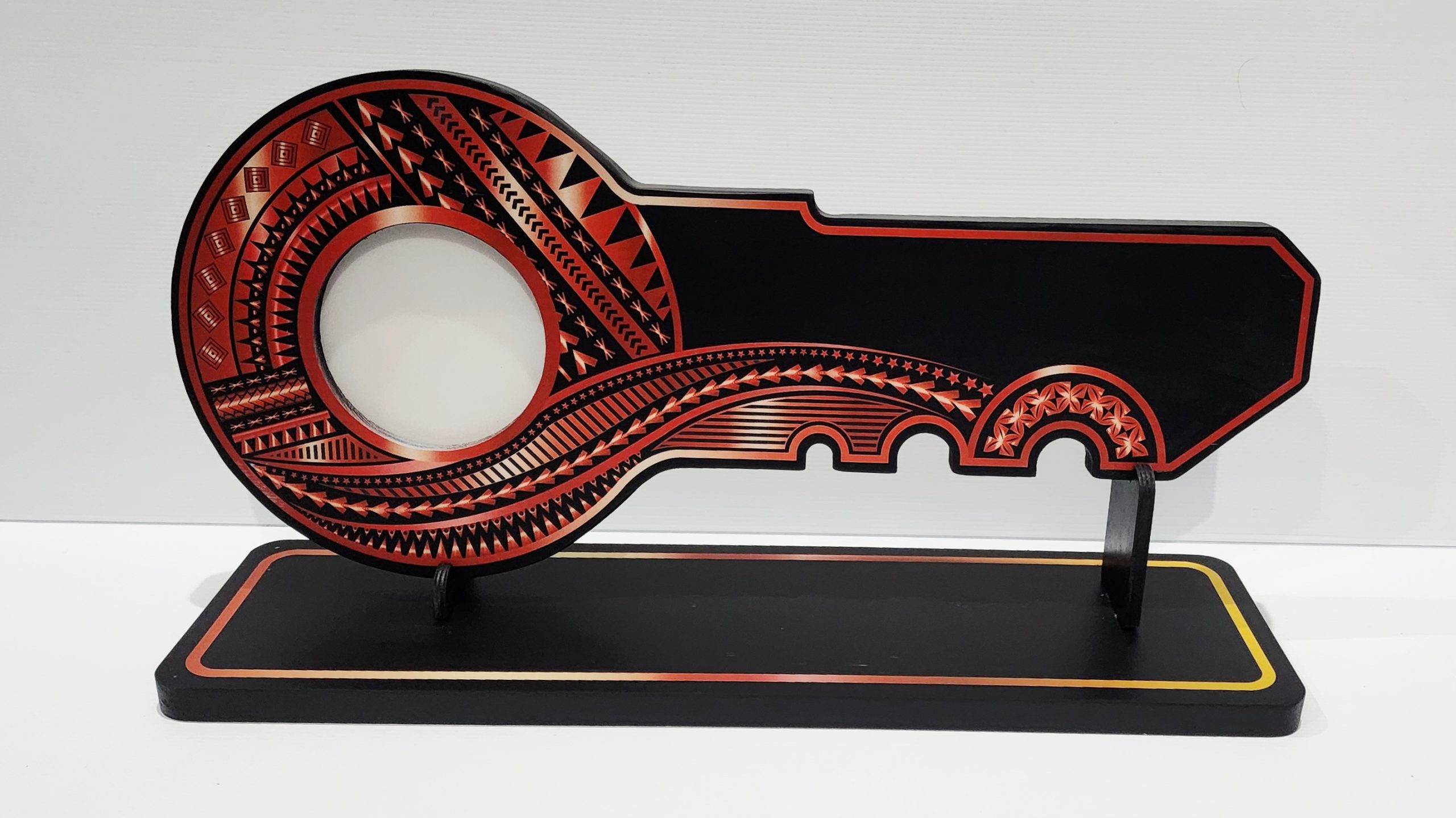 Celebrate a special milestone with this vibrant Island Design Birthday Key, featuring a striking red, white and black UV-printed colour theme. Crafted with attention to detail, the left side showcases a 12 cm round photo space surrounded by bold island-inspired patterns. On the right, a 220 mm × 60 mm custom engraving area allows you to add a personalised name, date or heartfelt message — making this a truly memorable keepsake.
