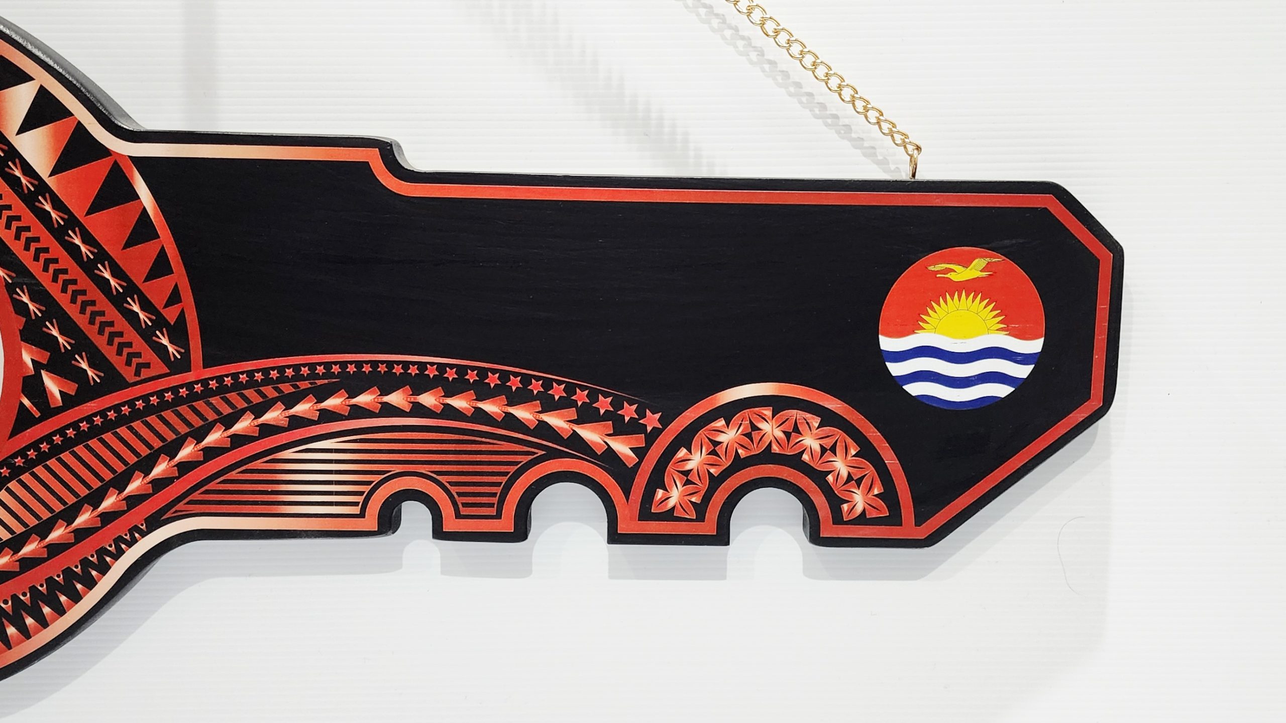 On the far right, a colourful round Kiribati flag is UV-printed to honour island pride and heritage. The key also includes a dedicated 220 mm × 60 mm area for custom engraving — ideal for adding the celebrant’s name, message, or important date.