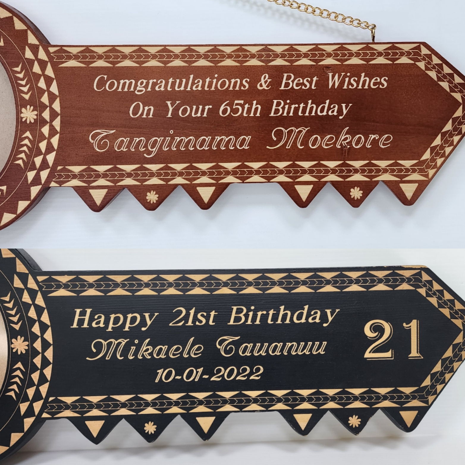Celebrate a milestone in true island style with this beautifully crafted 21st birthday key. Made from solid timber, it features intricate laser-engraved island patterns across the left side, highlighted by a bold “21” design in the centre.
