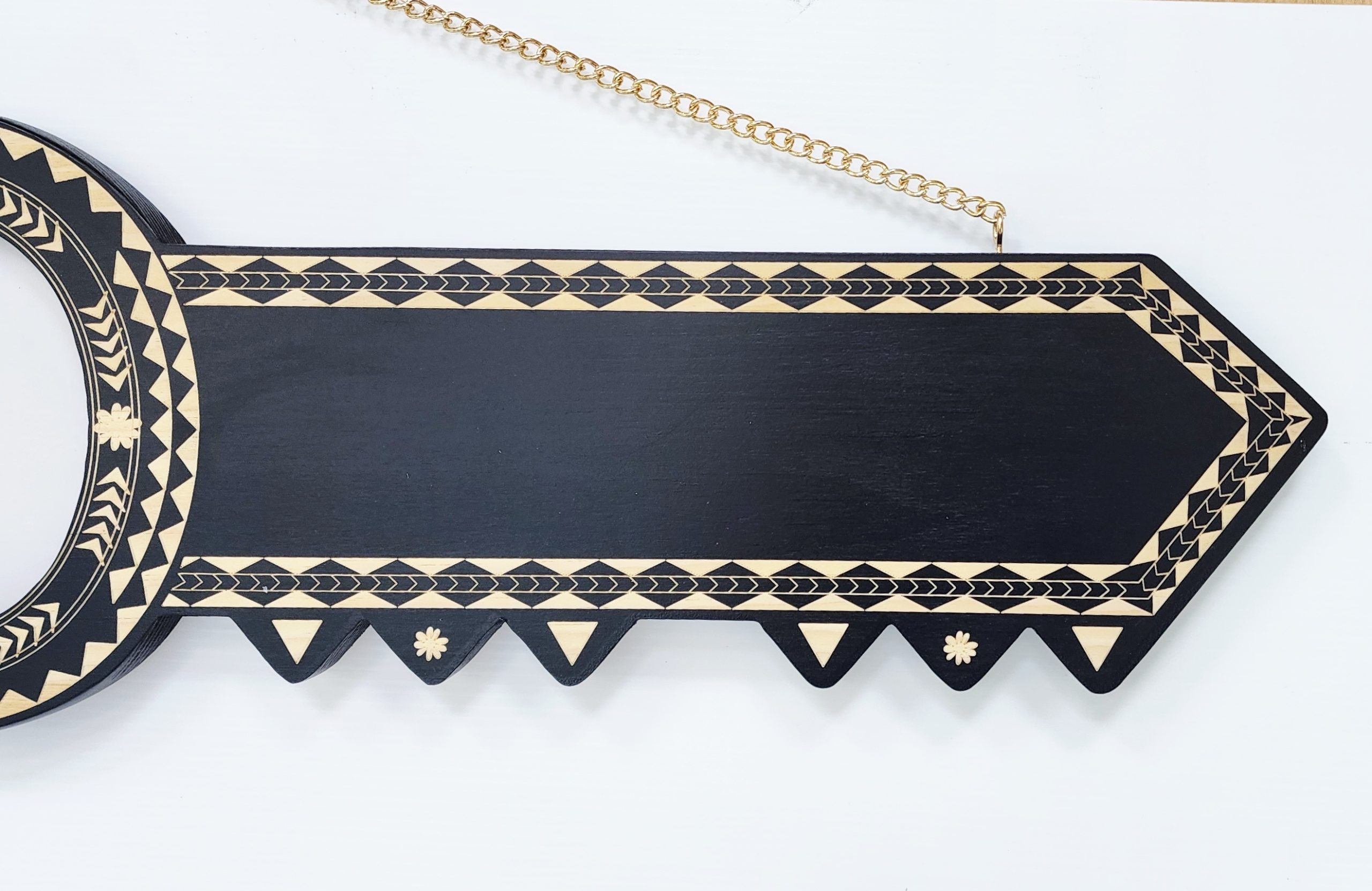 The key comes with a golden colour chain ready to hang on the wall. The black shade may vary due to the natural wood variations.
