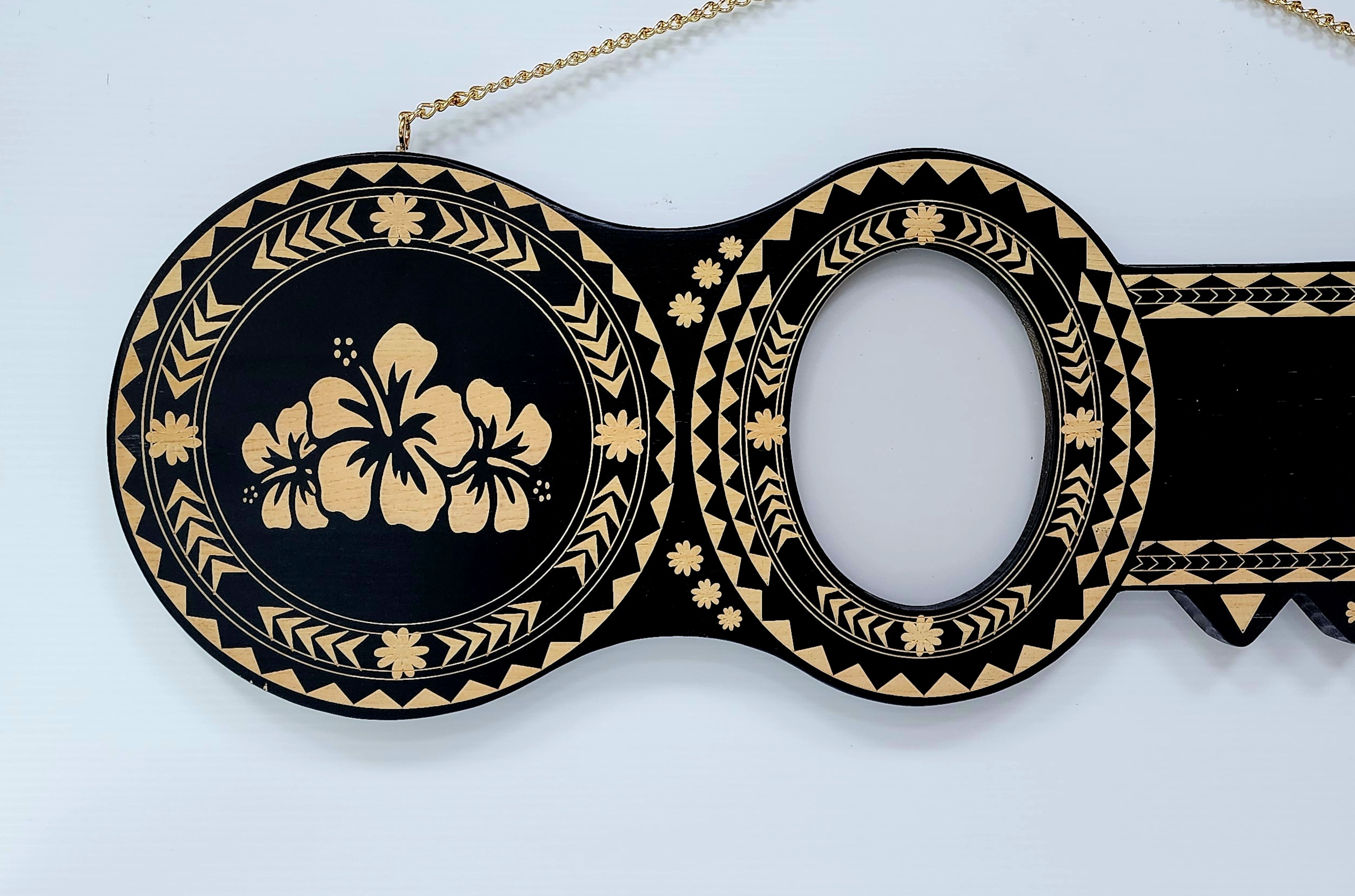 The left side of the key showcases detailed laser-engraved island motifs along the edges with a triple hibiscus flower design at the center. It features an oval photo space measuring 90mm x 120mm, perfect for a memorable picture.