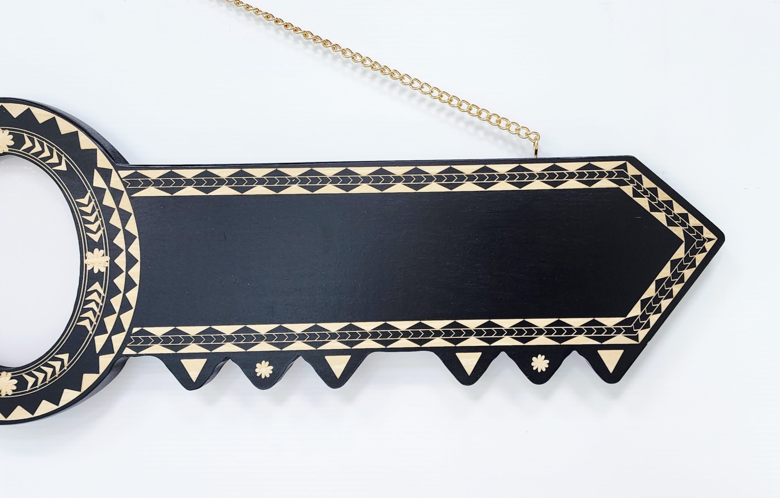 The key comes with a golden colour chain ready to hang on the wall. The black shade may vary due to the natural wood variations.