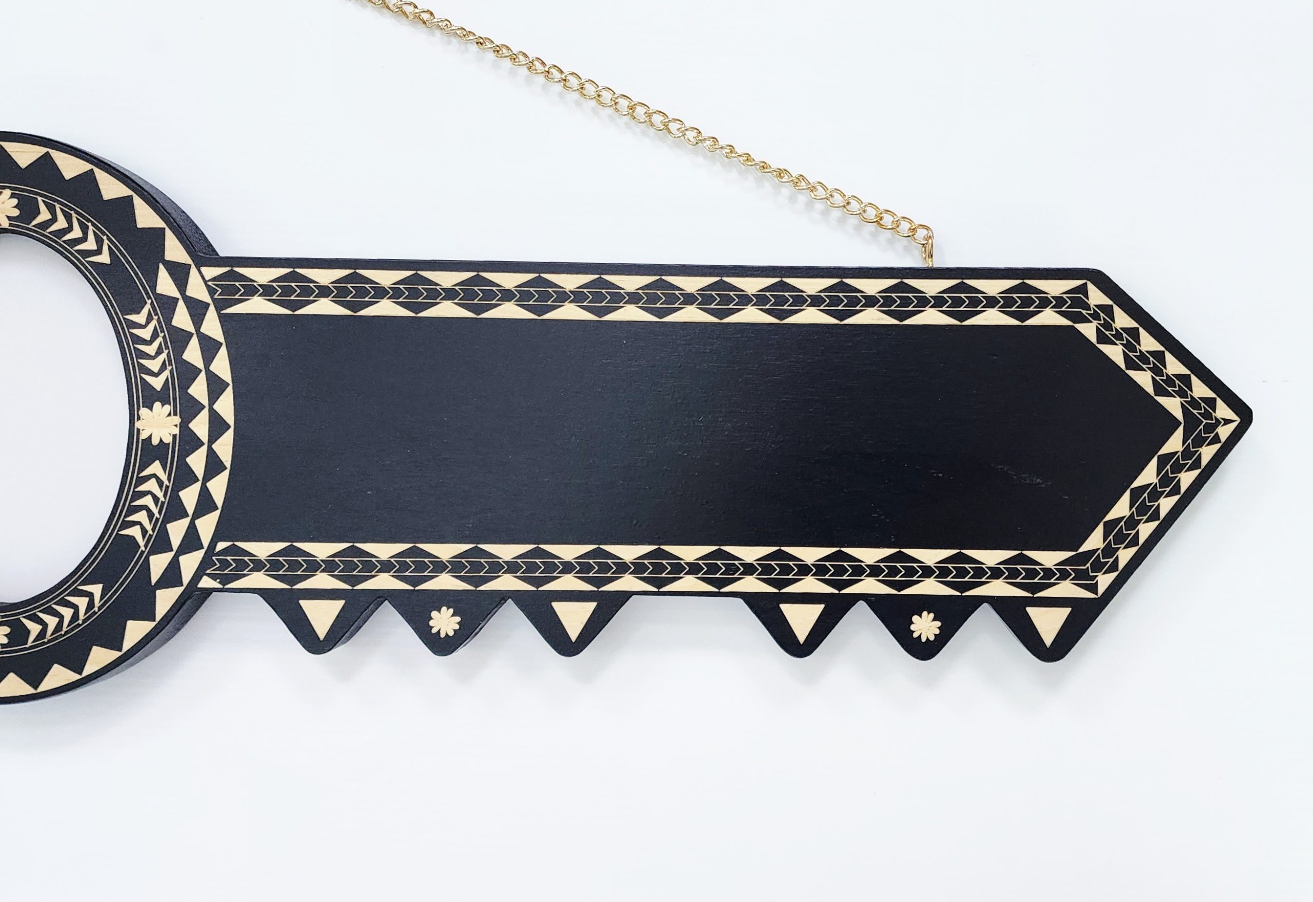The key comes with a golden colour chain ready to hang on the wall. The black shade may vary due to the natural wood variations.