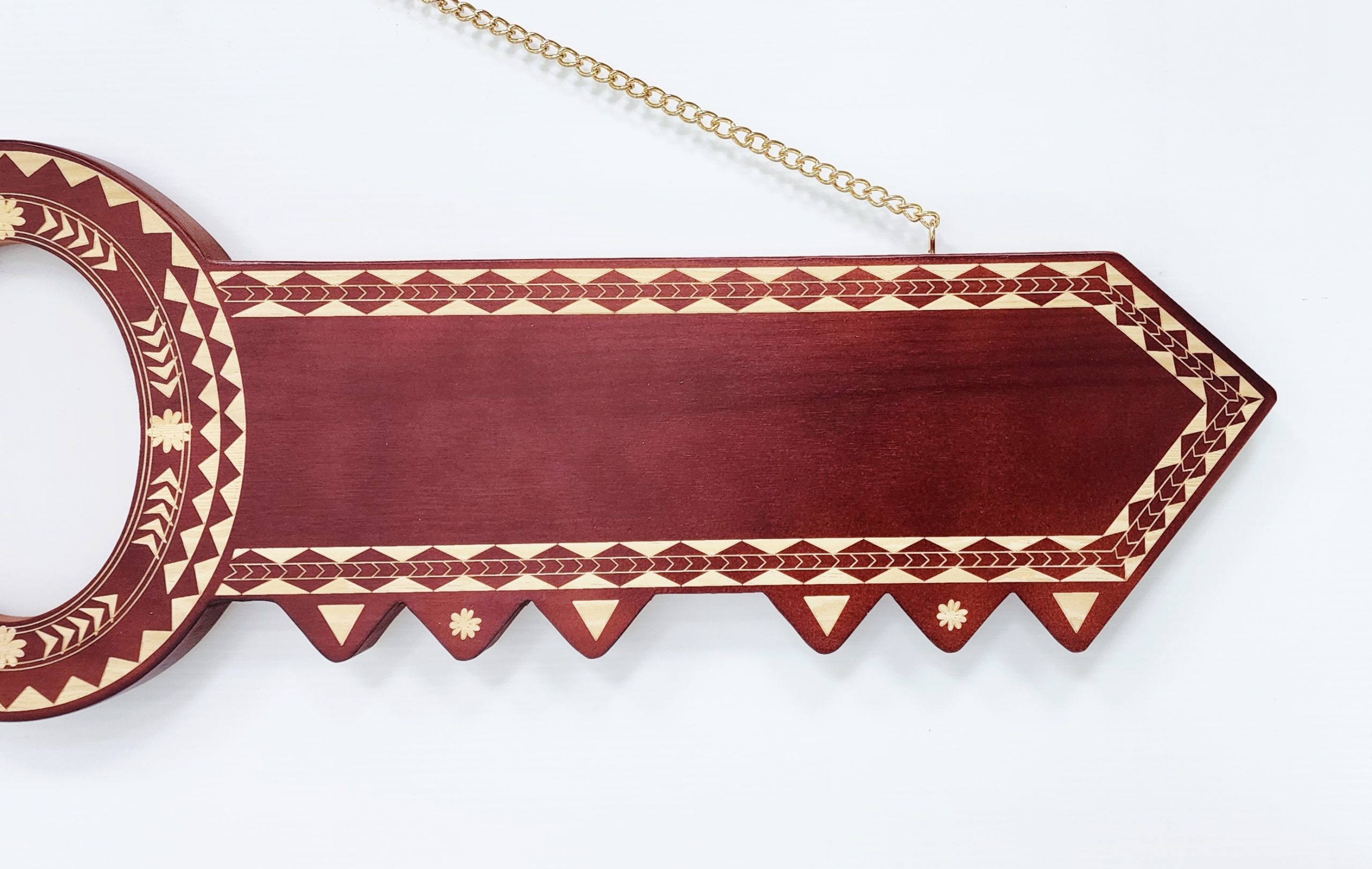 The key comes with a golden colour chain ready to hang on the wall. The brown shade may vary due to the natural wood variations.