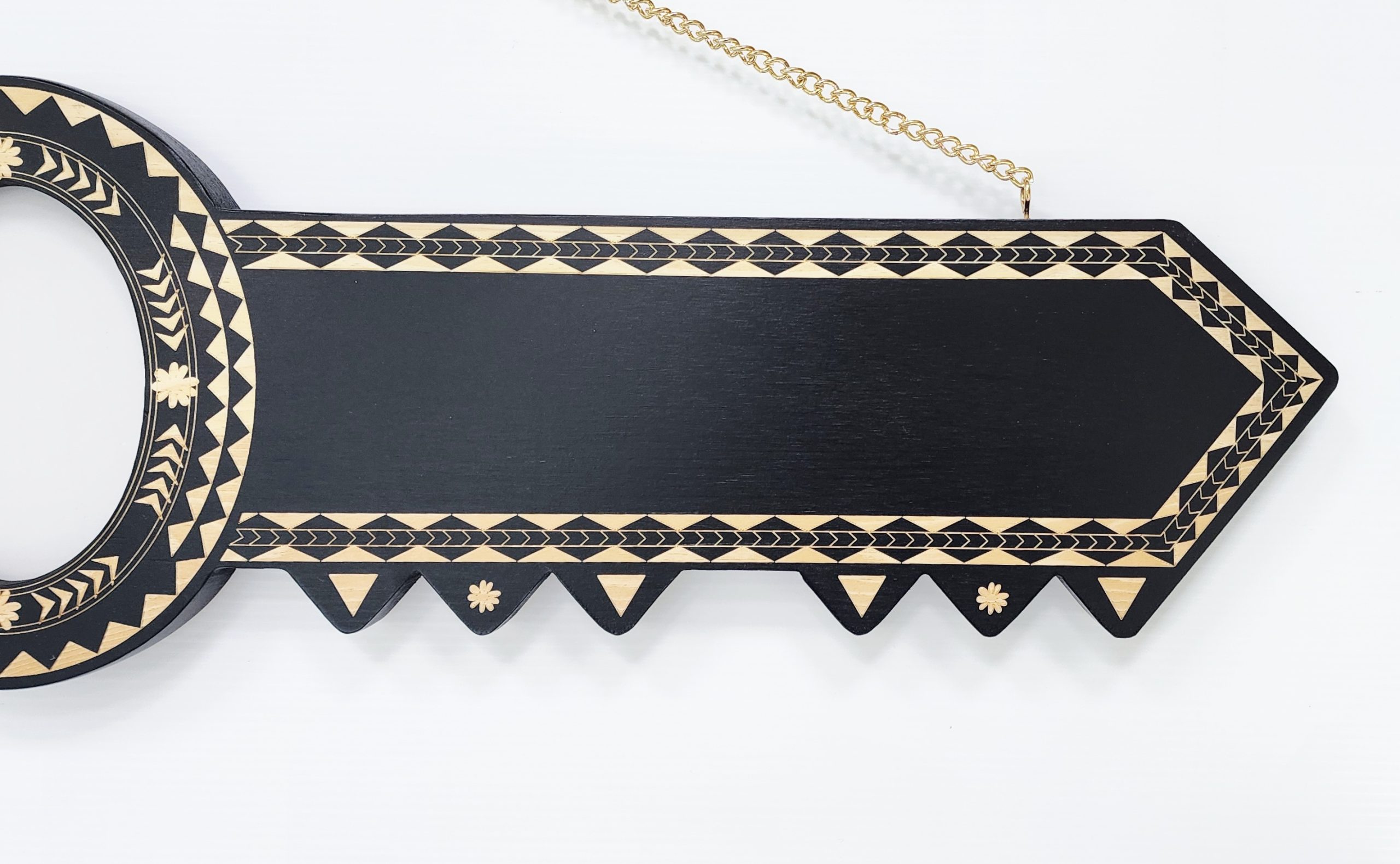 The key comes with a golden colour chain ready to hang on the wall. The black shade may vary due to the natural wood variations.