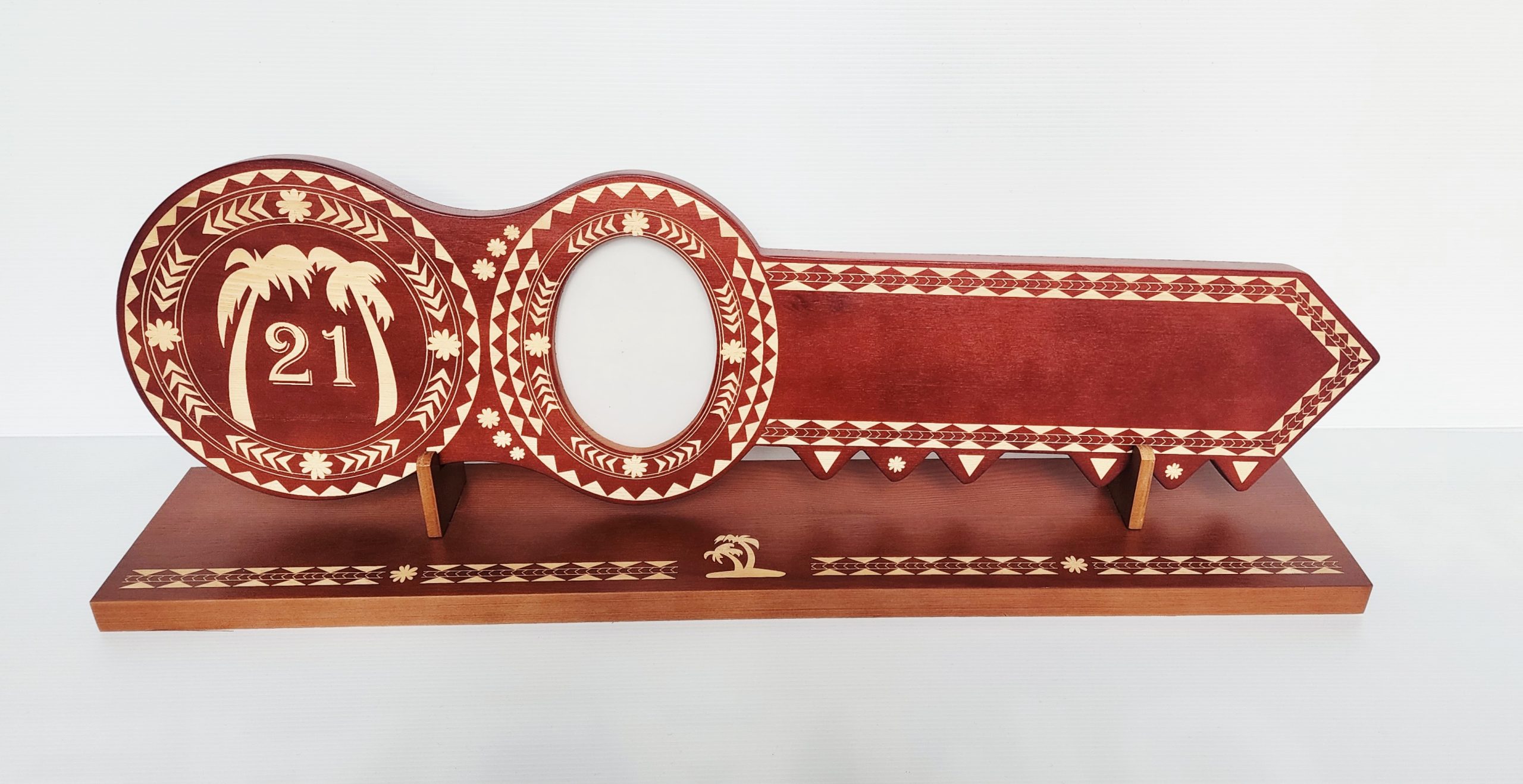 Celebrate a milestone with this beautifully crafted Island Design 21st Birthday Key. Made from solid timber, this key features finely laser-engraved island patterns across its surface.